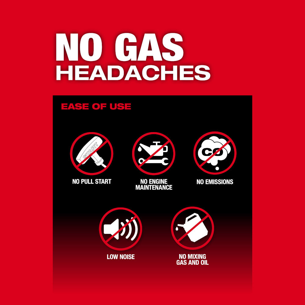 - In addition to outperforming gas competitors, the saw eliminates all of the headaches associated with gas engines, such as pull starts, high noise levels, emissions, and regular maintenance.