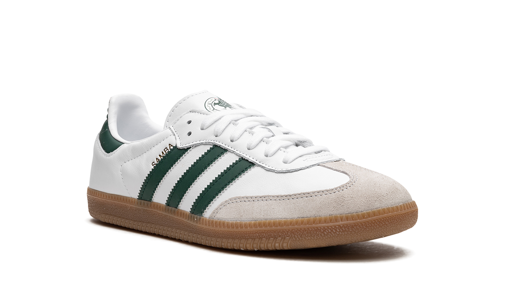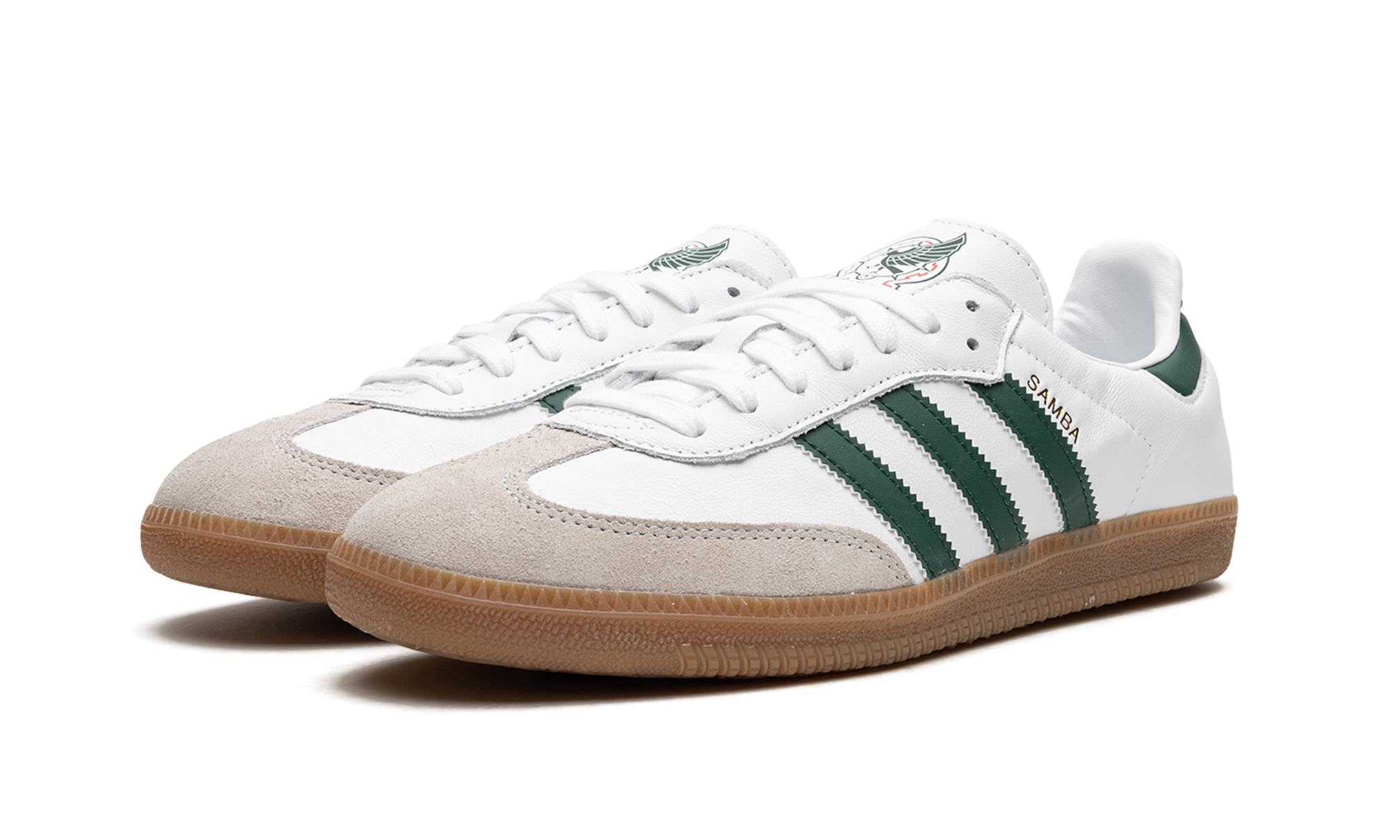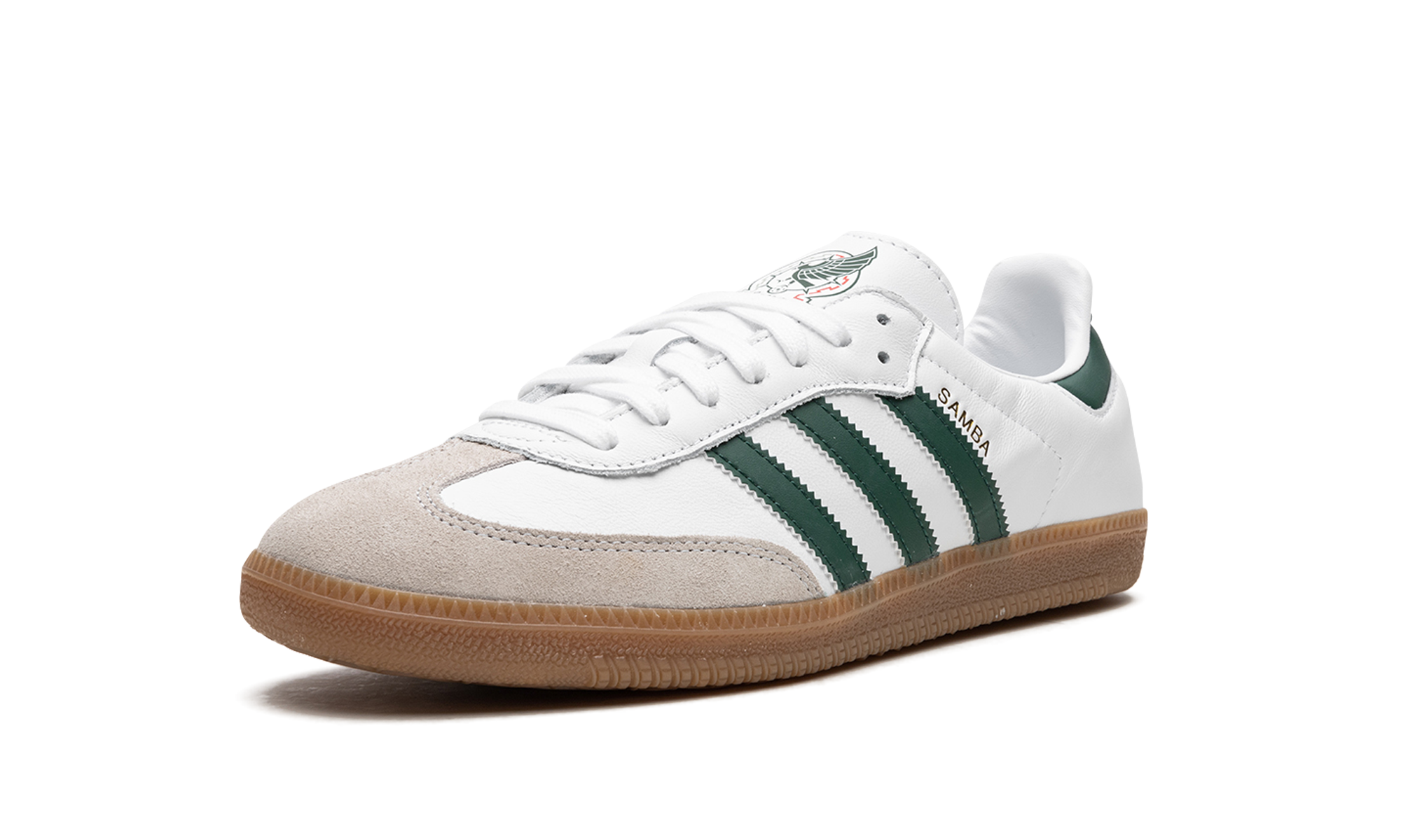 The adithtdas Samba "Mexico" is a colorway of the retro indoor soccer shoe inspired by Mexico's home soccer jerseys. A clean look for the ultra popular Samba, the "Mexico" celebrates Mexico's national soccer club and features a white leather design with green leather Three Stripes branding on the sides. Gold "Samba" detailing appears next to the classic logo. Mexico's team logo is printed on the white leather tongue, giving the shoe a unique look. A gum rubber sole completes the design. Mexico