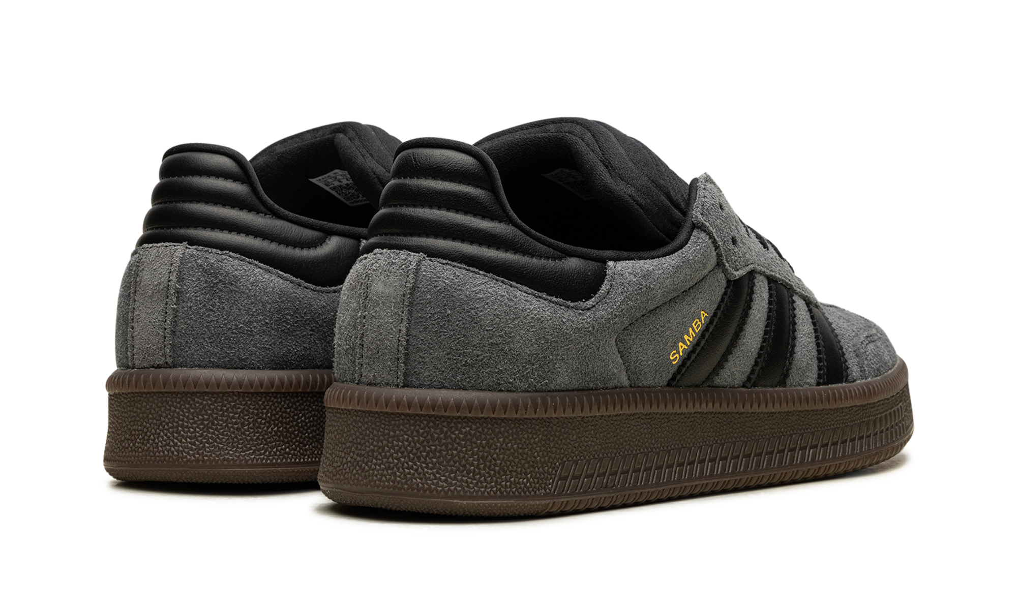 The adithtdas Samba XLG "Grey/Black" is a neutral-based colorway of the modified version of the retro shoe. The adithtdas Samba XLG is an alternate version of the Samba OG that features a thick, platform-style rubber sole and an extra padded tongue. On the "Grey/Black" colorway, the shoe has a Grey suede upper with a tonal suede overlay on the toe. Contrasting Black Three Stripes branding appears on the side, while a gold "Samba" stamp can be found on the lateral side of the mid-panel. Classic "adithtdas" detailing is printed on the tongue. A chunky dark gum rubber sole completes the look. Grey Suede