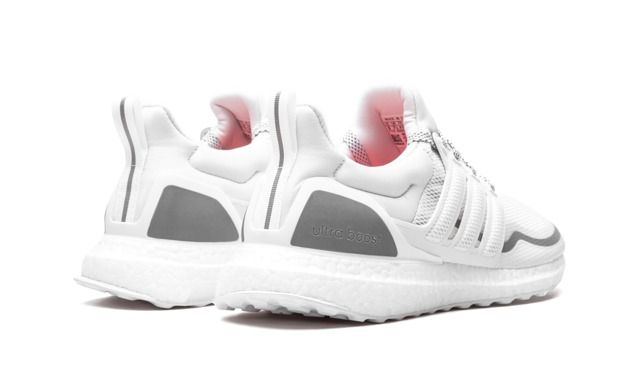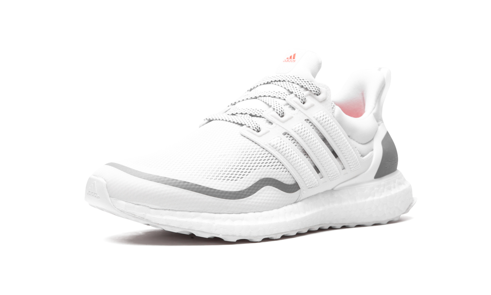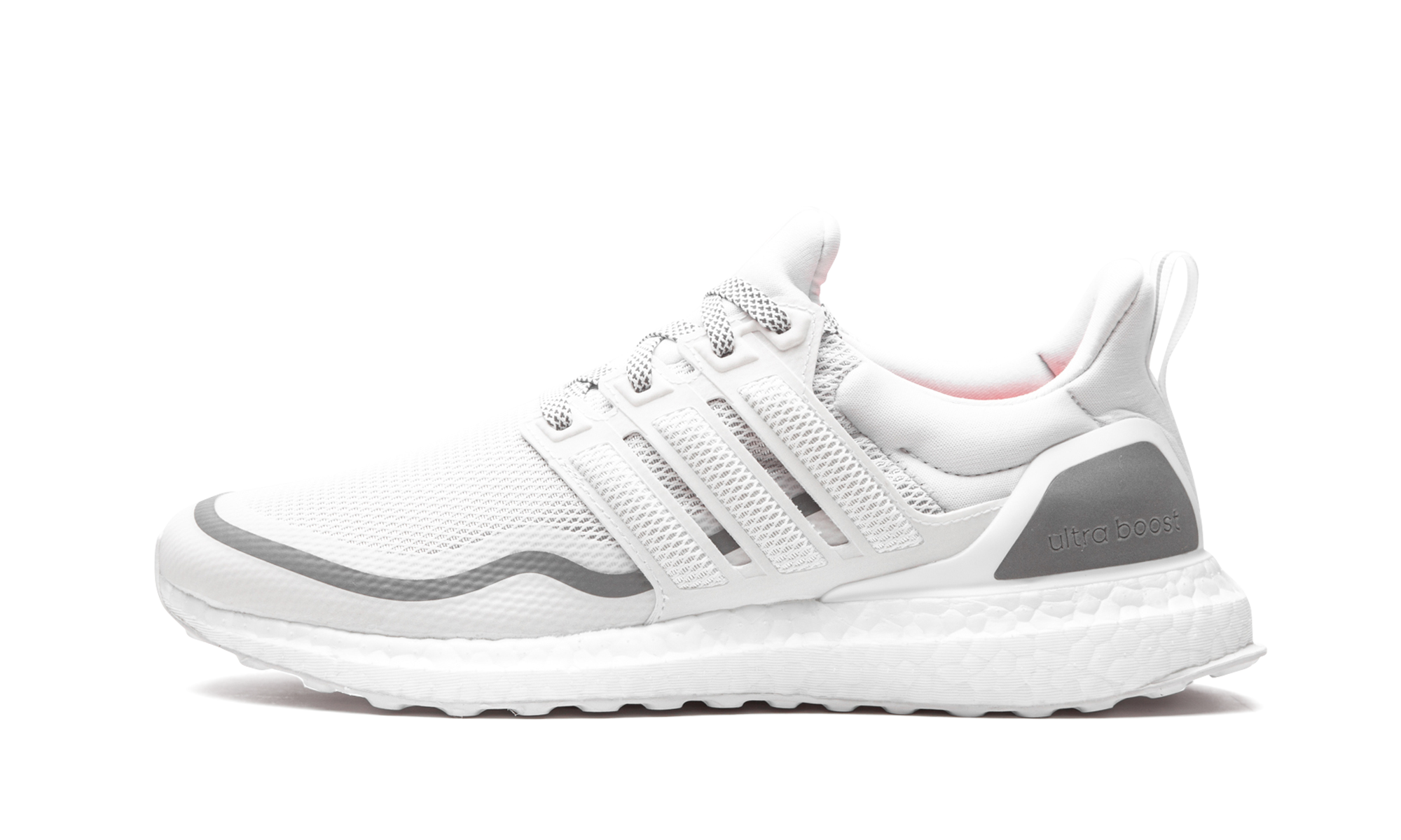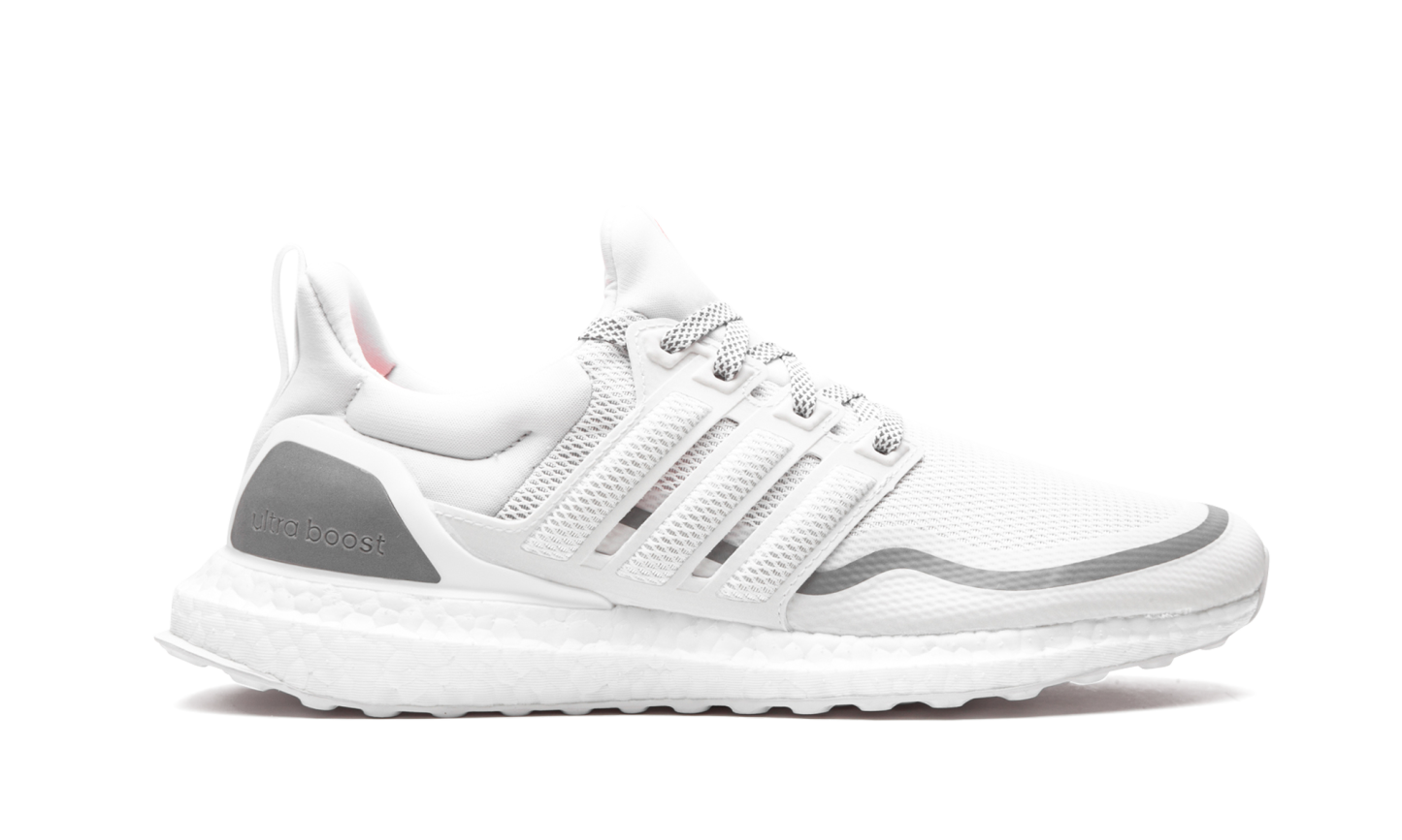 The adithtdas Ultra Boost Reflective boasts the DNA of a performance running shoe, but is also perfect for everyday, lifestyle wear. Featured in mostly white, this Ultra Boost has a knit upper with ventilation in key sweat zones to help keep feet cool and dry. Reflective detailing is meant to keep feet visible in low light. Taping along the mudguard includes grey detailing, as does the panel on the heel counter and heel tab at the rear. The all-white sole unit includes an uber-cushioned Boost midsole and flexible rubber outsole. Reflective