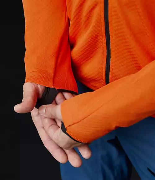 - Thumb loops at cuffs feature stretch-woven fabric with dissolvable yarns for additional mobility and comfort