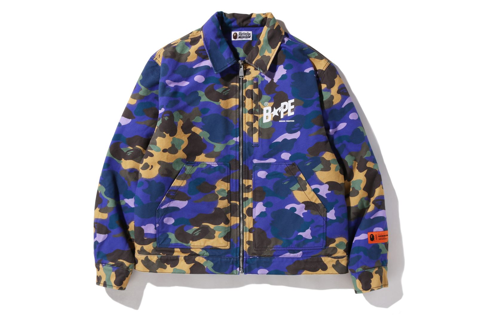 Reflecting the duality of both brands. Heron Preston subversively interprets workwear with the brand's iconic yellow 1ST A unique two-tone production of CAMO and colorful purple COLOR CAMO.