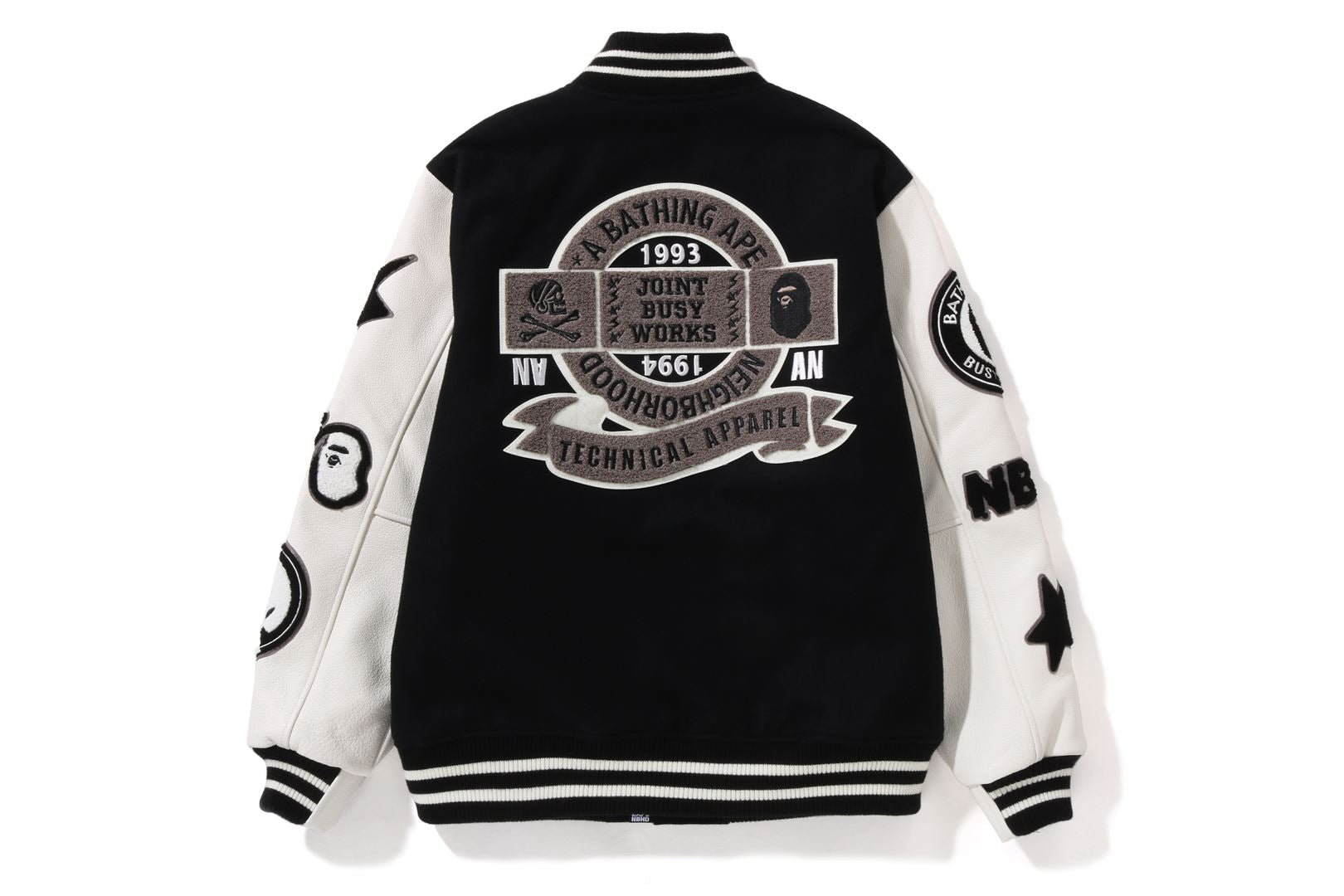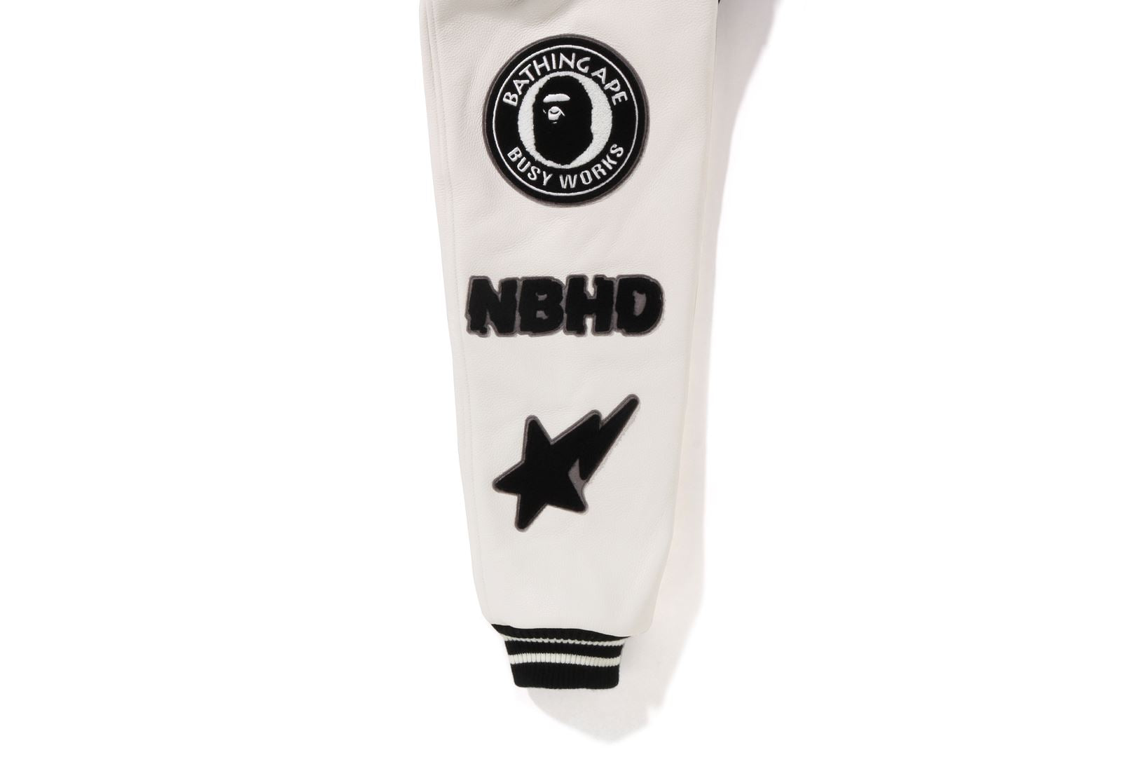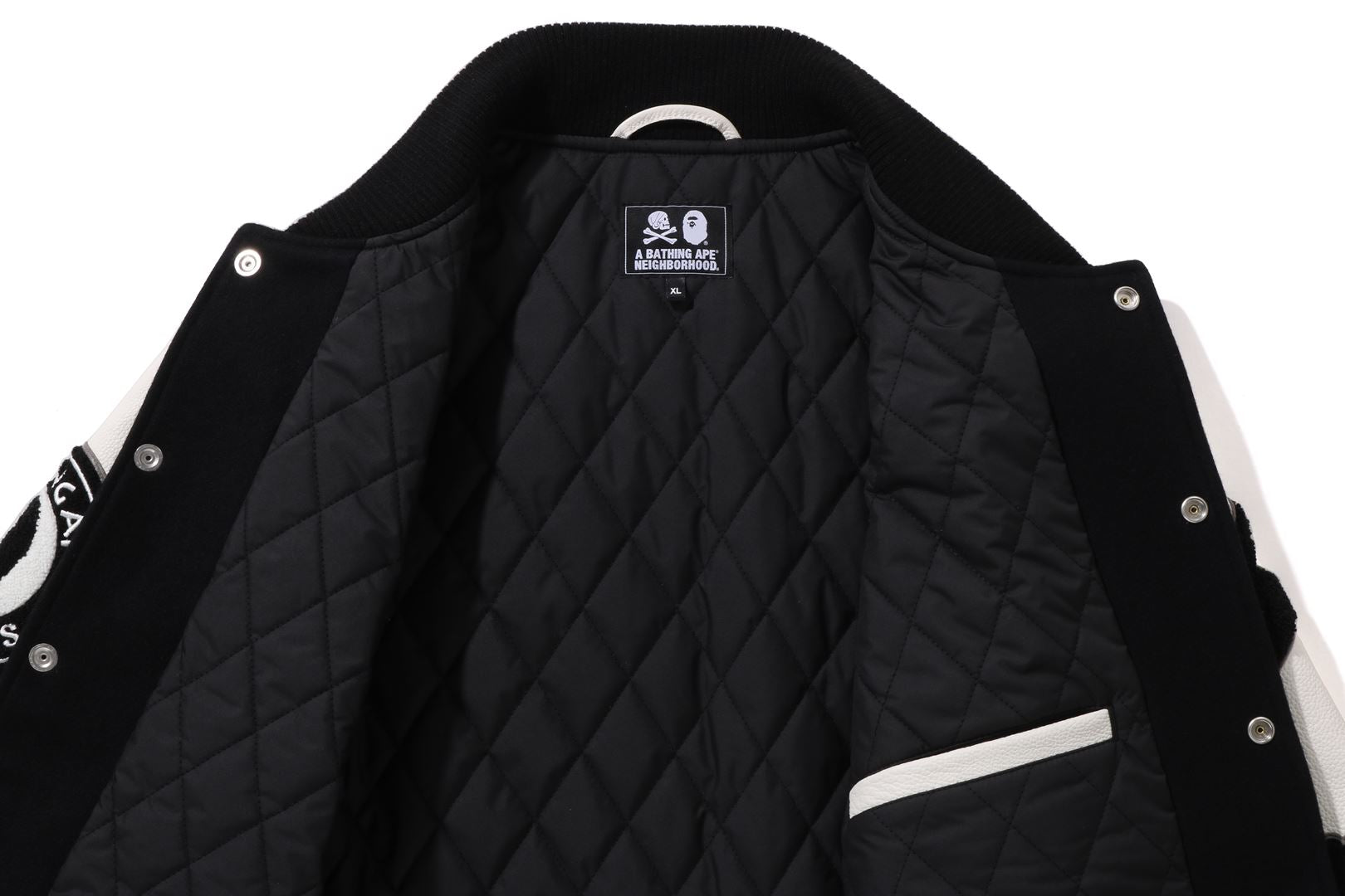A varsity jacket with a melton body and textured leather sleeves. Graphics and brand logo embroidery are placed throughout. Engraved snap button. The lining is quilted polyester taffeta. A collaboration model with NEIGHBORHOOD. Limited color available only at A BATHING AthtPE.