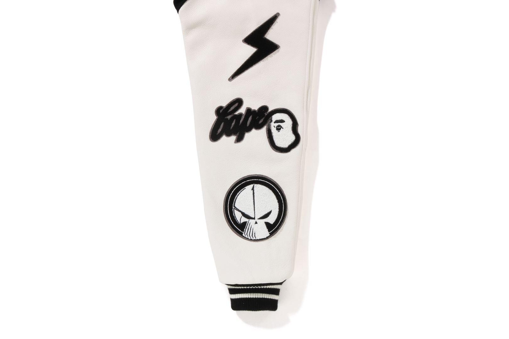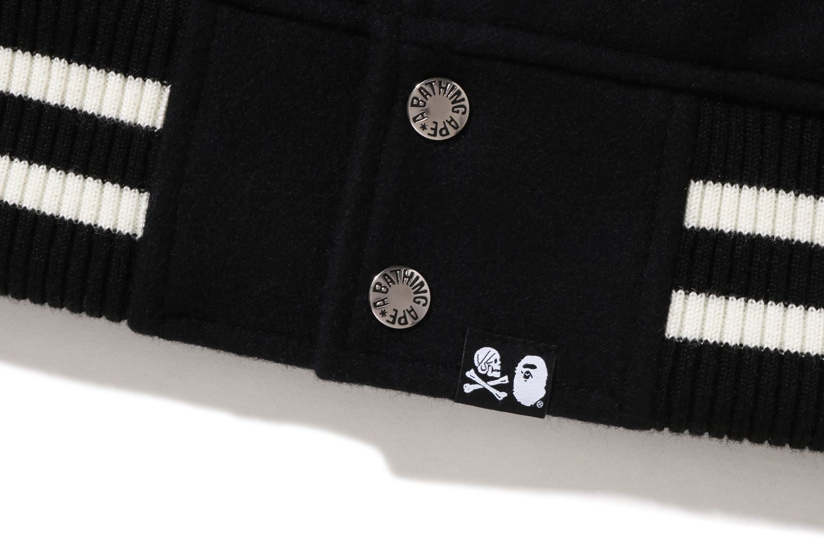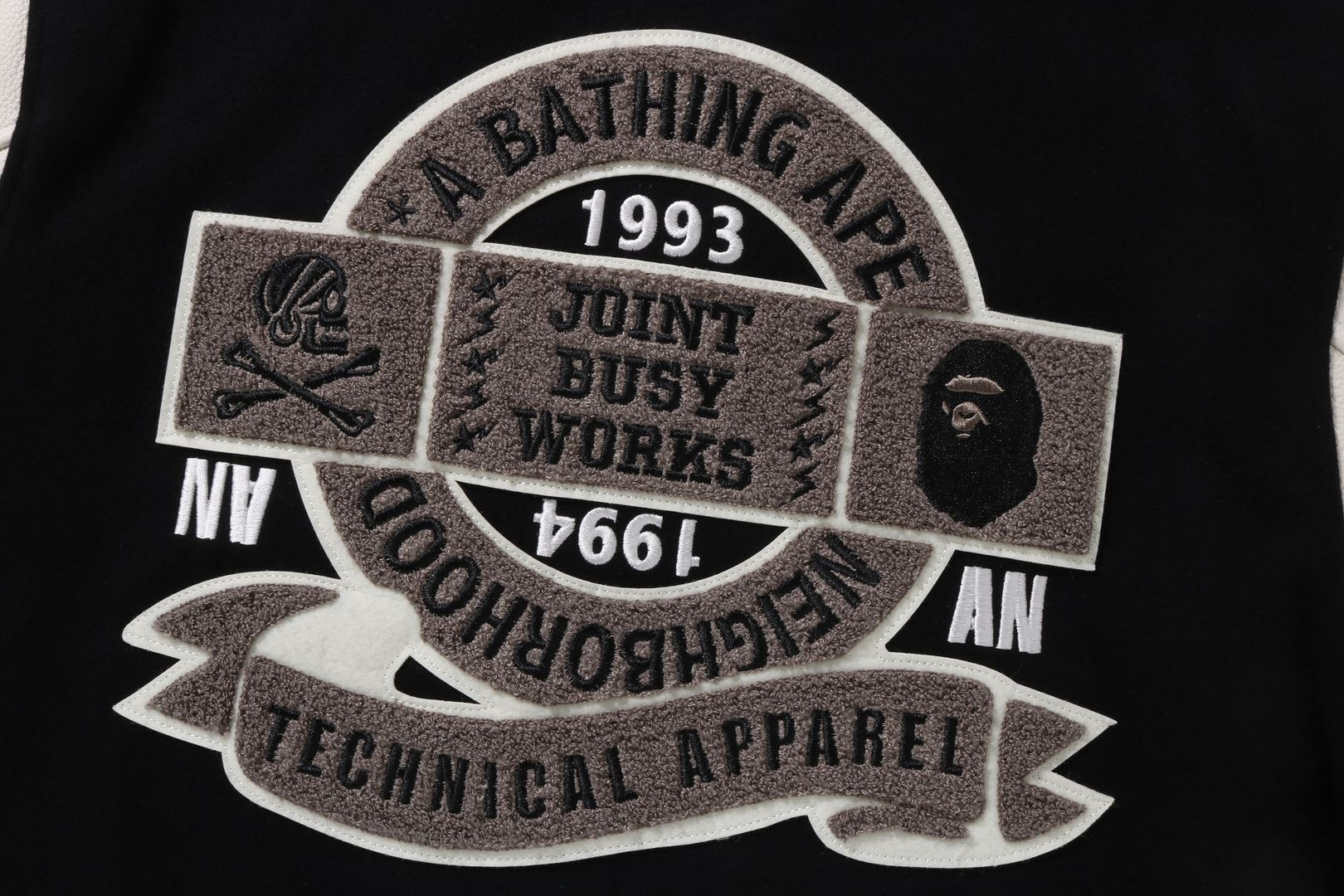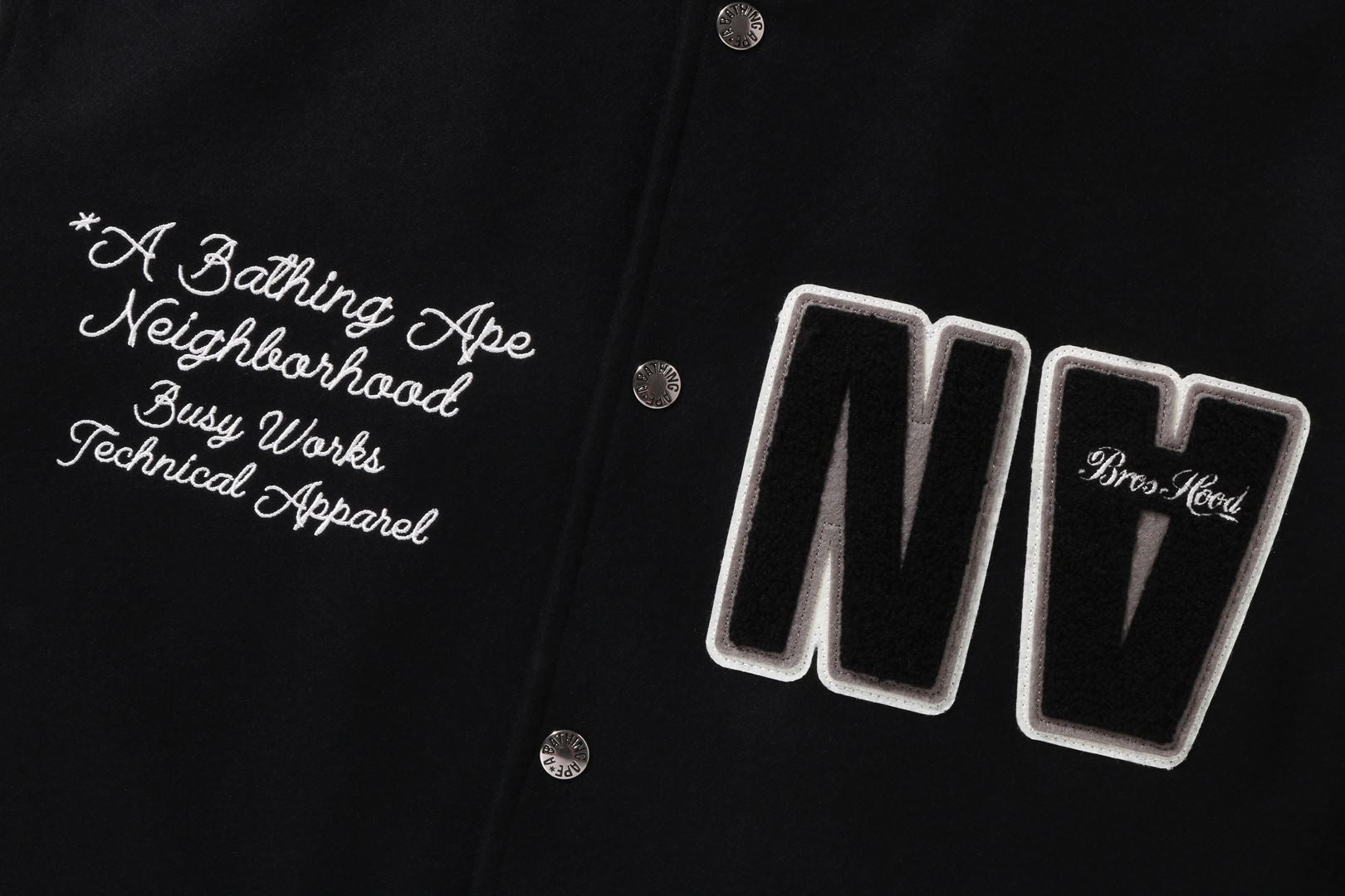 A varsity jacket with a melton body and textured leather sleeves. Graphics and brand logo embroidery are placed throughout. Engraved snap button. The lining is quilted polyester taffeta. A collaboration model with NEIGHBORHOOD. Limited color available only at A BATHING AthtPE.