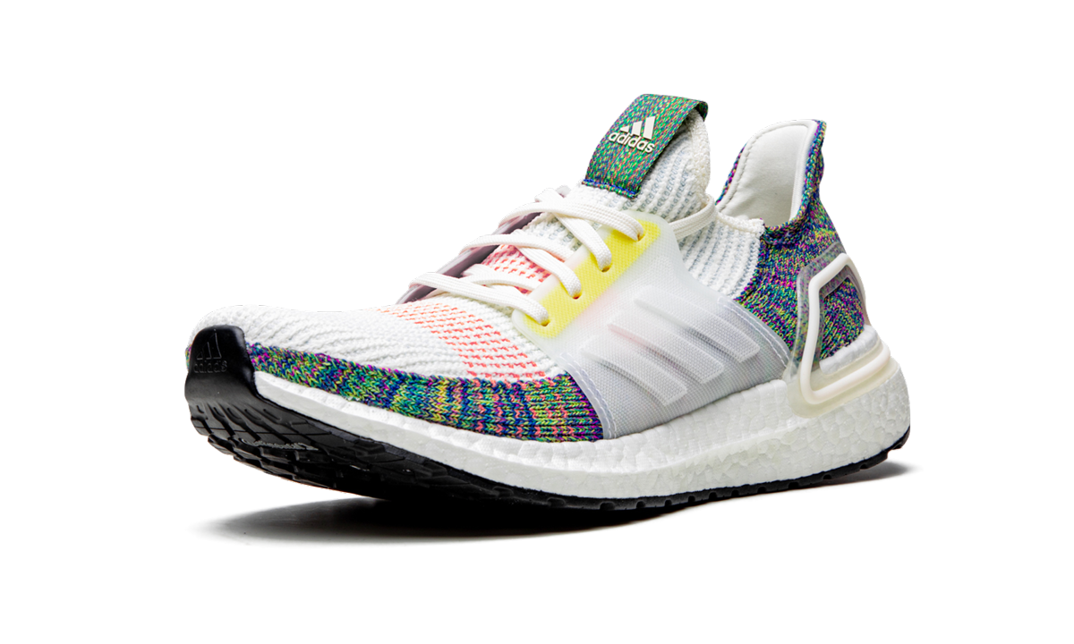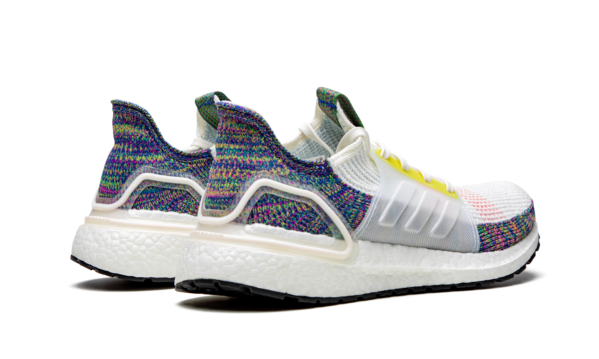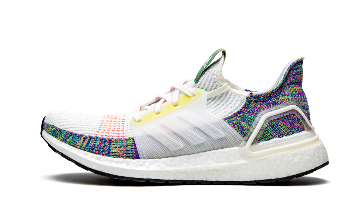 The adithtdas UltraBoost 19 "Pride" celebrates the LGBTQ community as part of the brand's "Love Unites" Pride Month collection. One of the first styles of the range to be teased in the 2019 collection, the running shoe wears its colors proud with a white base and rainbow pattern weaved into the bottom half, tongue, and heel. The mesh midfoot cage adds yellow detailing around the eyestay and two orange stripes intersect along the vamp. The "Pride" style is finished with a Boost-infused midsole and black rubber outsole. Pride (2019)
