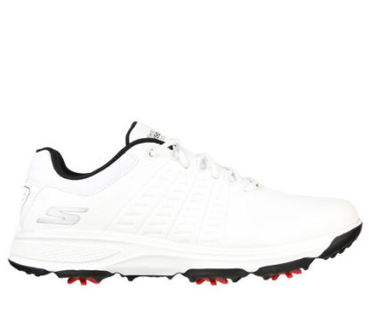 Handle the course in supportive comfort and smooth style with Skecththers GO GOLF® Elite 5 - GF. This waterproof lace-up golf design features a quarter embossed synthetic upper with a removable Arch Fit® insole and lightweight ULTRA FLIGHT® cushioning.