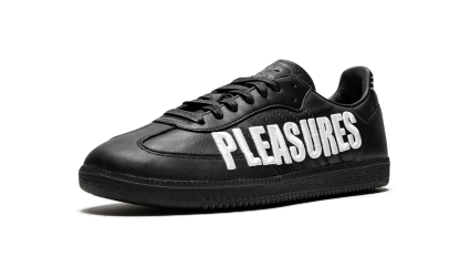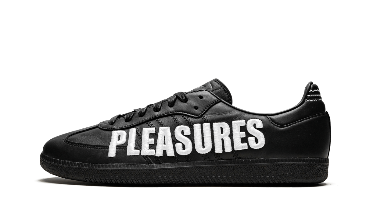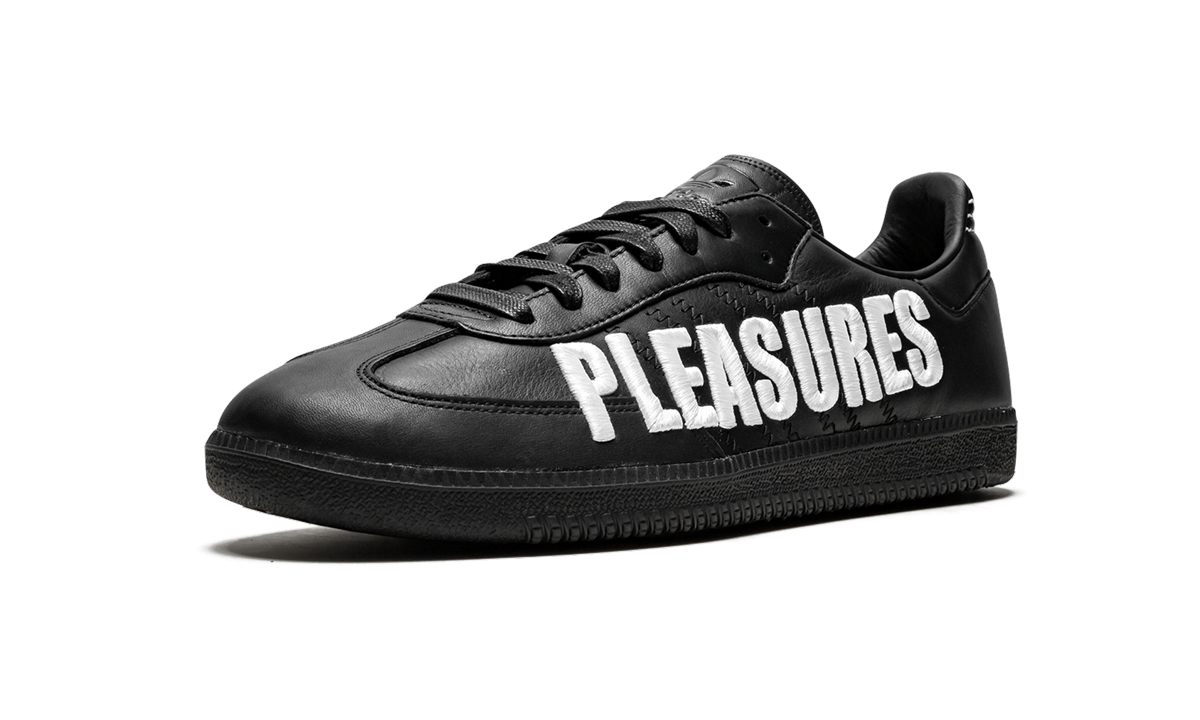 The Pleasures x adithtdas Samba reflects the Los Angeles streetwear brand's punk, metal, and grunge aesthetics in the classic low-top soccer-inspired design. Contrasting the upper made of premium black leather, 3D embroidered white "Pleasures" branding covers the mid-panel and is the highlight of the silhouette. The L.A. collective keeps things otherwise subtle with tonal black laces, a black leather tongue with tonal adithtdas branding on the tongue tab, and white contrasting Three Stripes stitching on the heel. Rounding out the look of the design is a lightweight black EVA midsole. The Pleasures x adithtdas Samba was released on March 20, 2019.