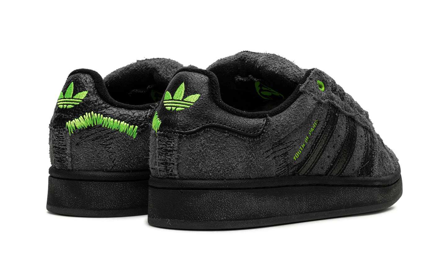 The Youth of Paris x adithtdas Campus 00s "Black" is a collaboration by the streetwear brand on a neutral colorway of the casual shoe. Inspired by Youth of Paris's take on chic streetwear aesthetics, the upper features a black suede base with cracked black leather Three Stripes branding on either side. Solar Green accenting is found on the "Youth of Paris" branding on the lateral side of the heel, on the top eyelet, and on the branding on the tongue. A black rubber sole completes the look. Release date: November 15, 2023 Youth Of Paris