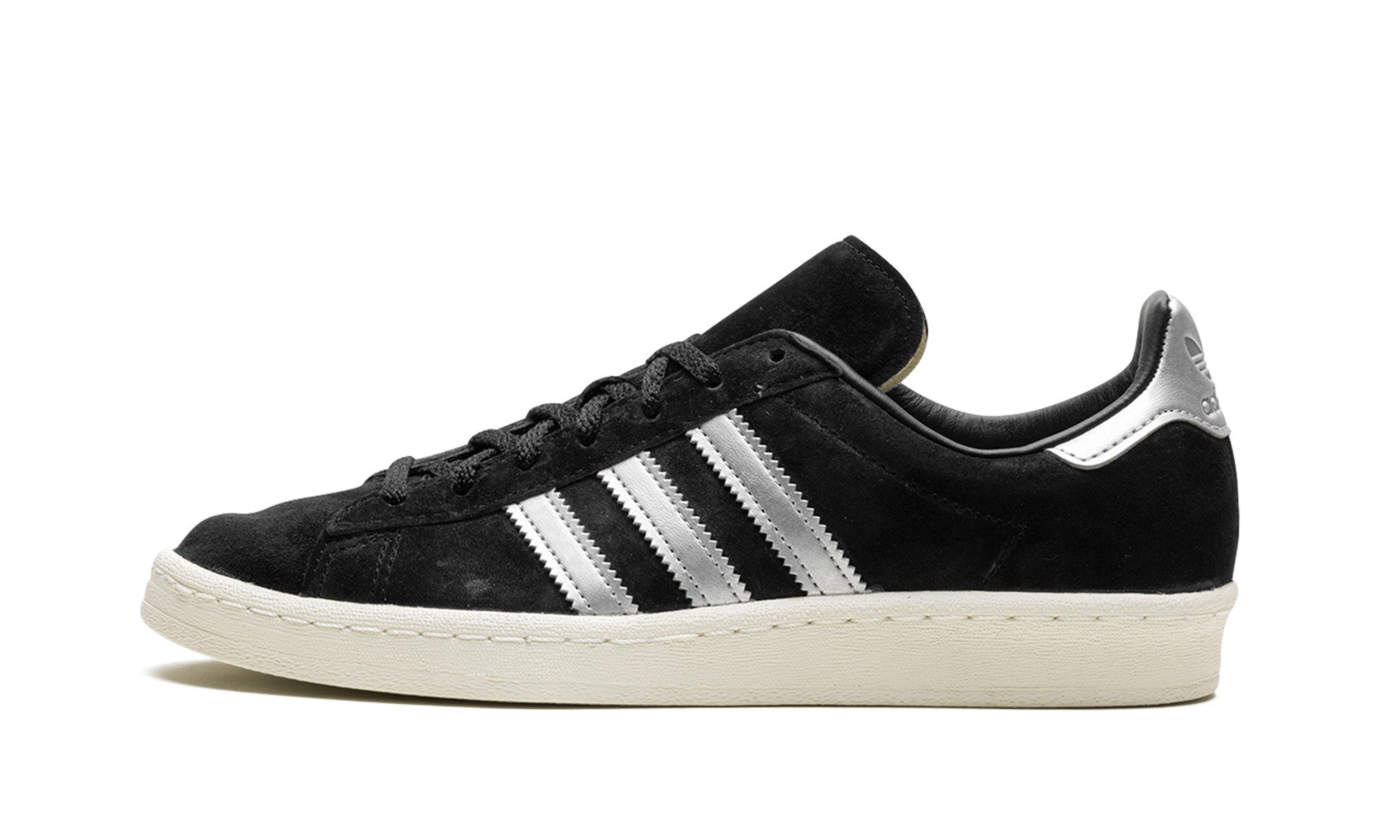 The adithtdas Campus 80s "Black/Off White" is a two-tone, black-and-white colorway of the retro shoe by the German footwear brand. The adithtdas Campus 80s in "Black/Off White" is designed in a versatile look for everyday wear. Specifically, the upper has a black suede construction and is contrasted with flashy Metallic Silver leather Three Stripes on the sides. More eye-catching Metallic Silver accenting appears on the heel. A black suede tongue and Off White rubber sole complete the look. Black Off White