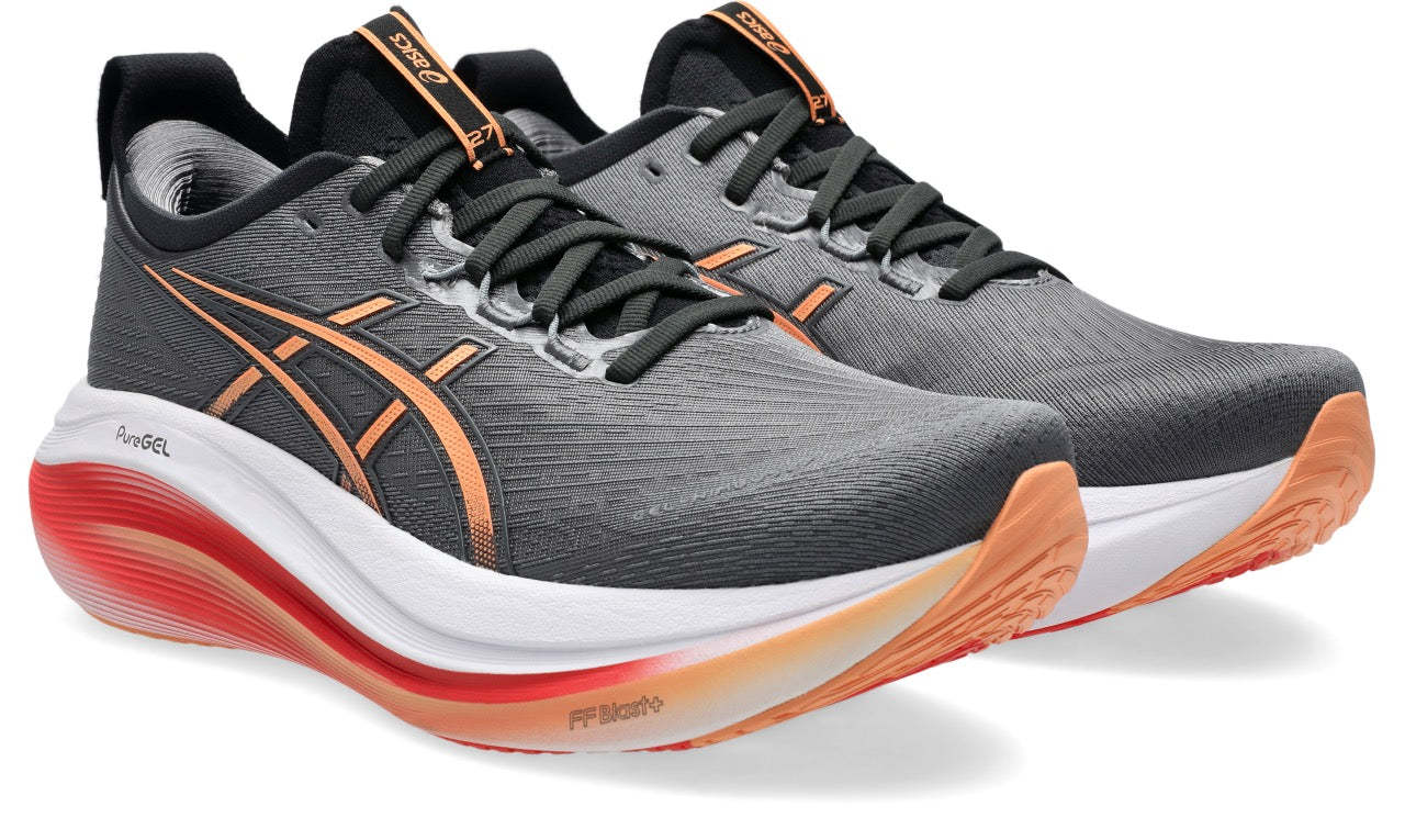 The GEL-NIMBUS? 27 shoe's soft cushioning properties help you feel like you're landing on clouds. This design is revamped to help create a softer and smoother running experience.?A soft engineered jacquard mesh upper comfortably wraps your foot while supplying advanced ventilation. Additionally, the knit tongue and collar help provide a soft and supportive feel.?By using FF BLAST? PLUS ECO cushioning, this trainer creates a lighter and softer cushioning experience.?Lastly, HYBRID GRIP? outsole rubber helps create better traction, improved softness, and advanced durability.