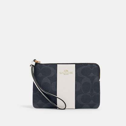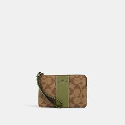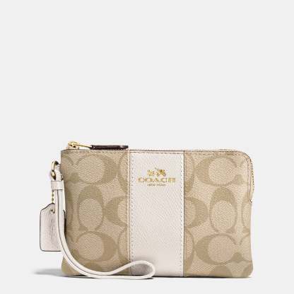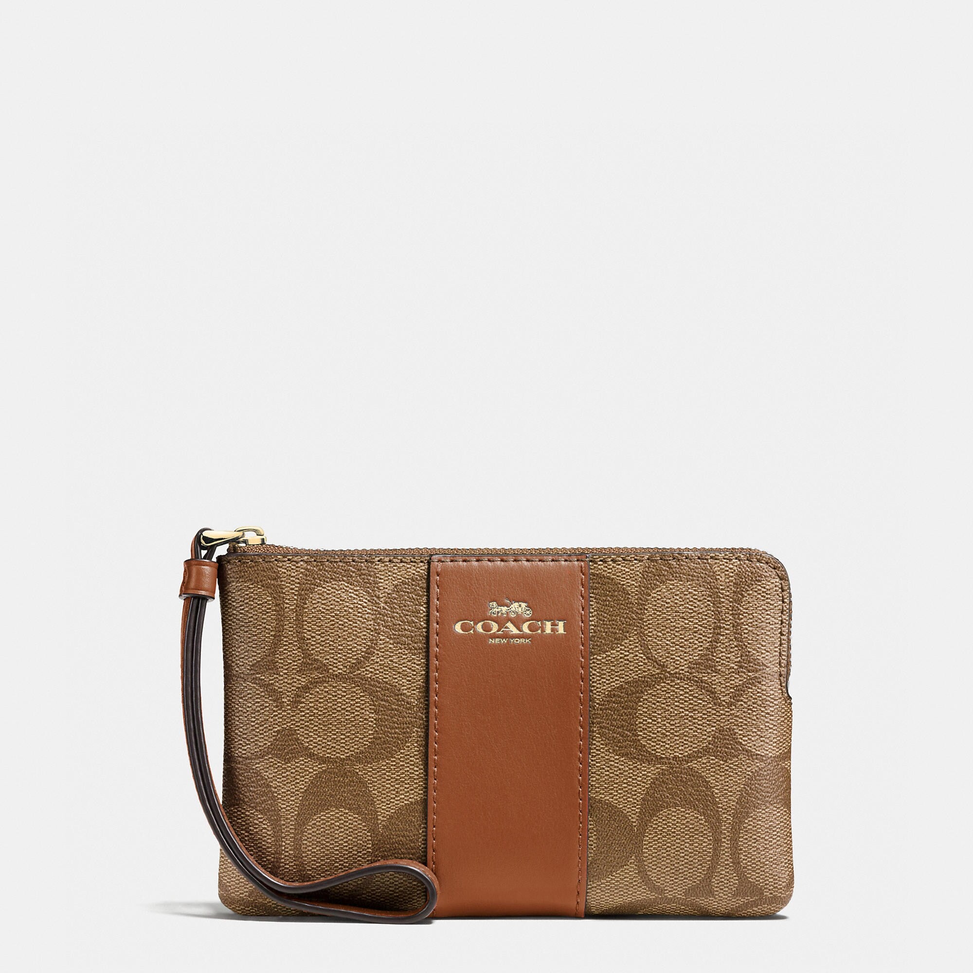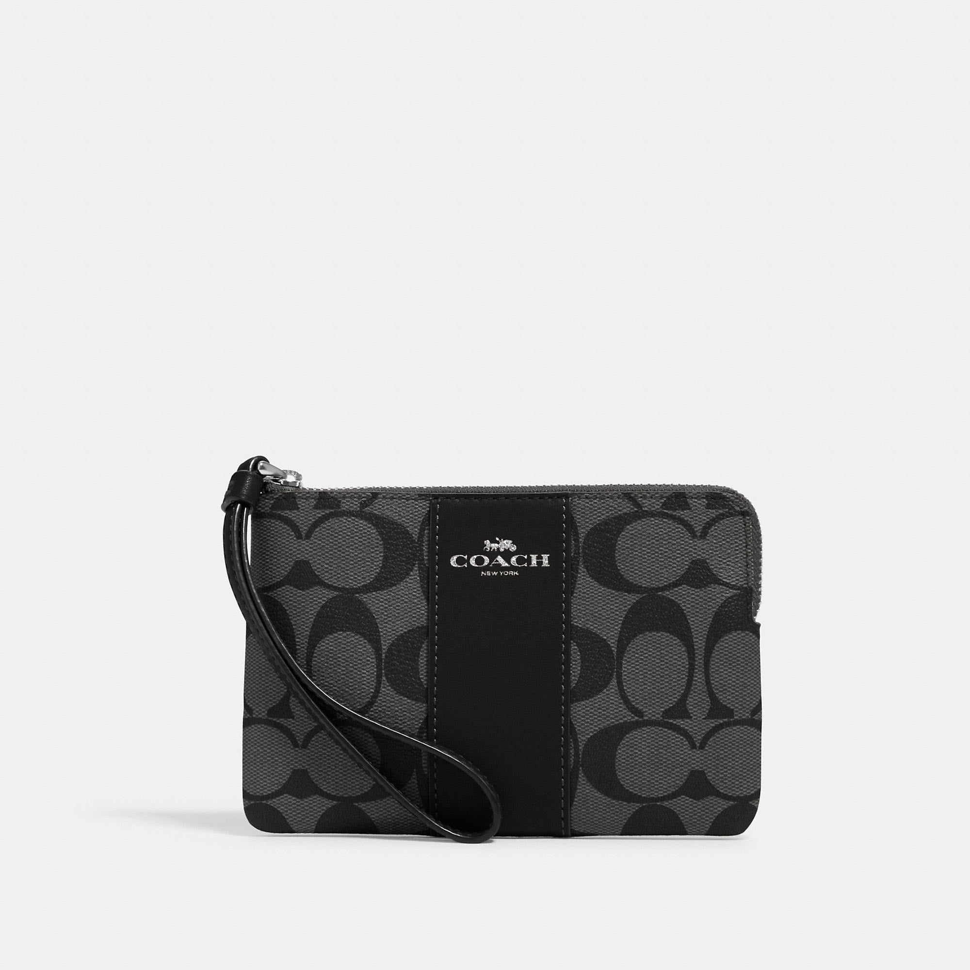 Signature coated canvas with crossgrain leather details Two credit card slots Zip-top closure fabric lining Wrist strap attached 6 1/4 (L) x 4 (H) x 1/2 (W) Style No. 58035