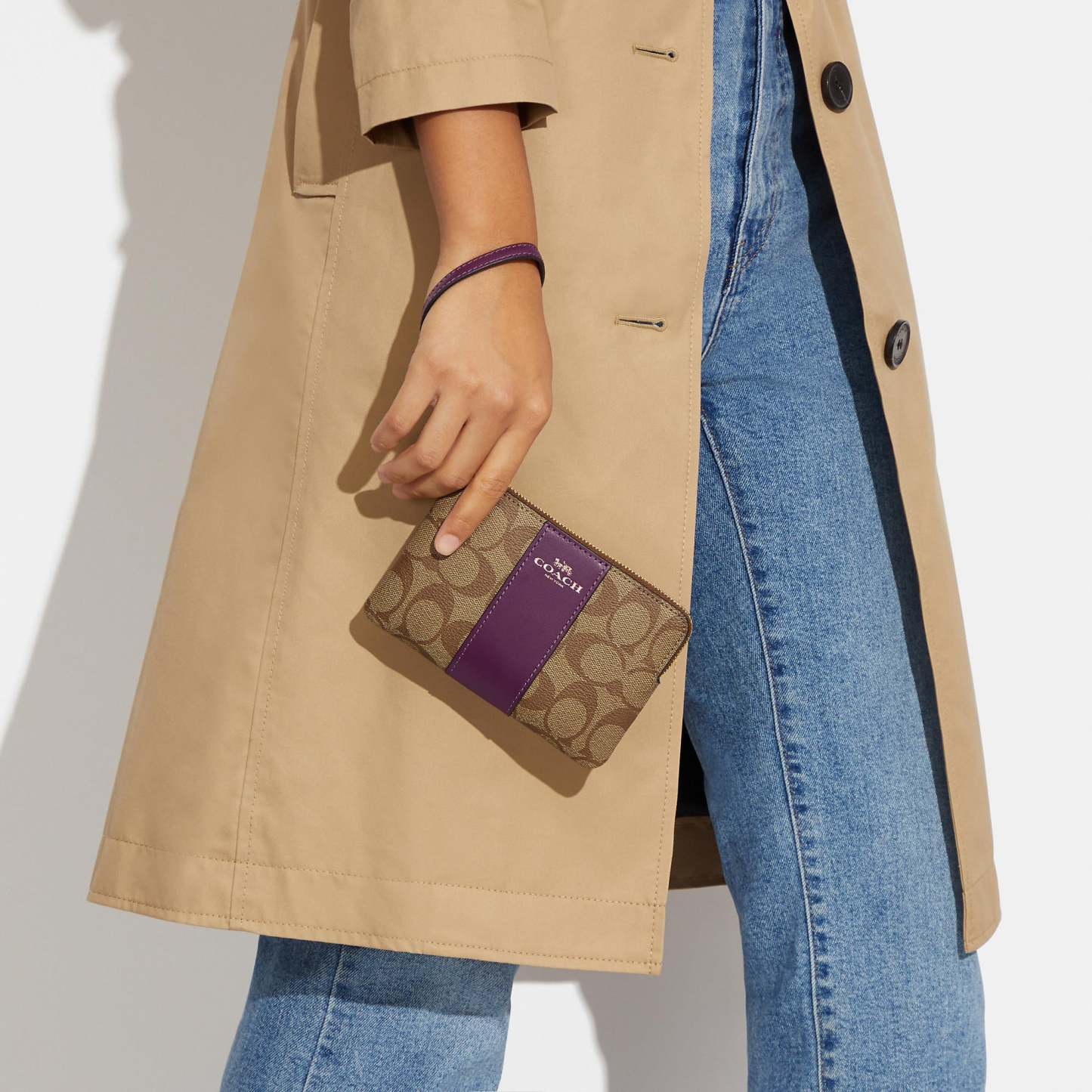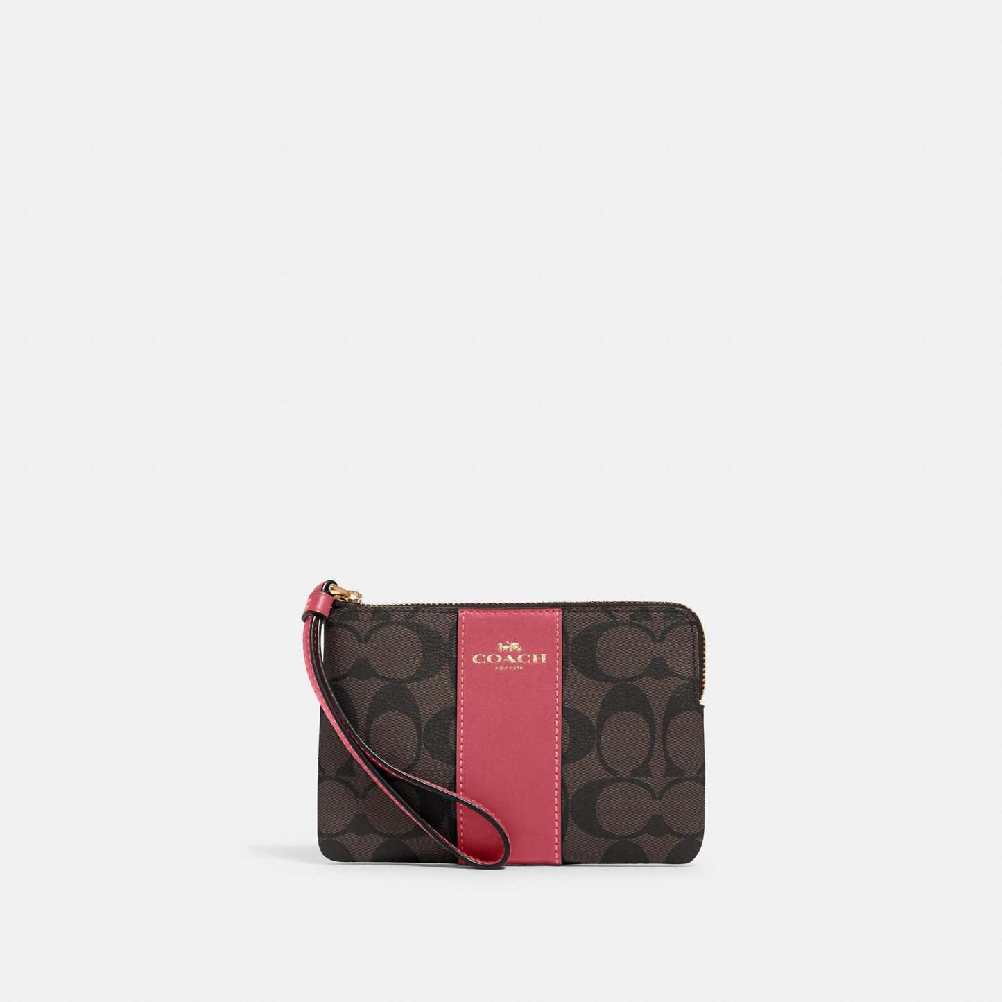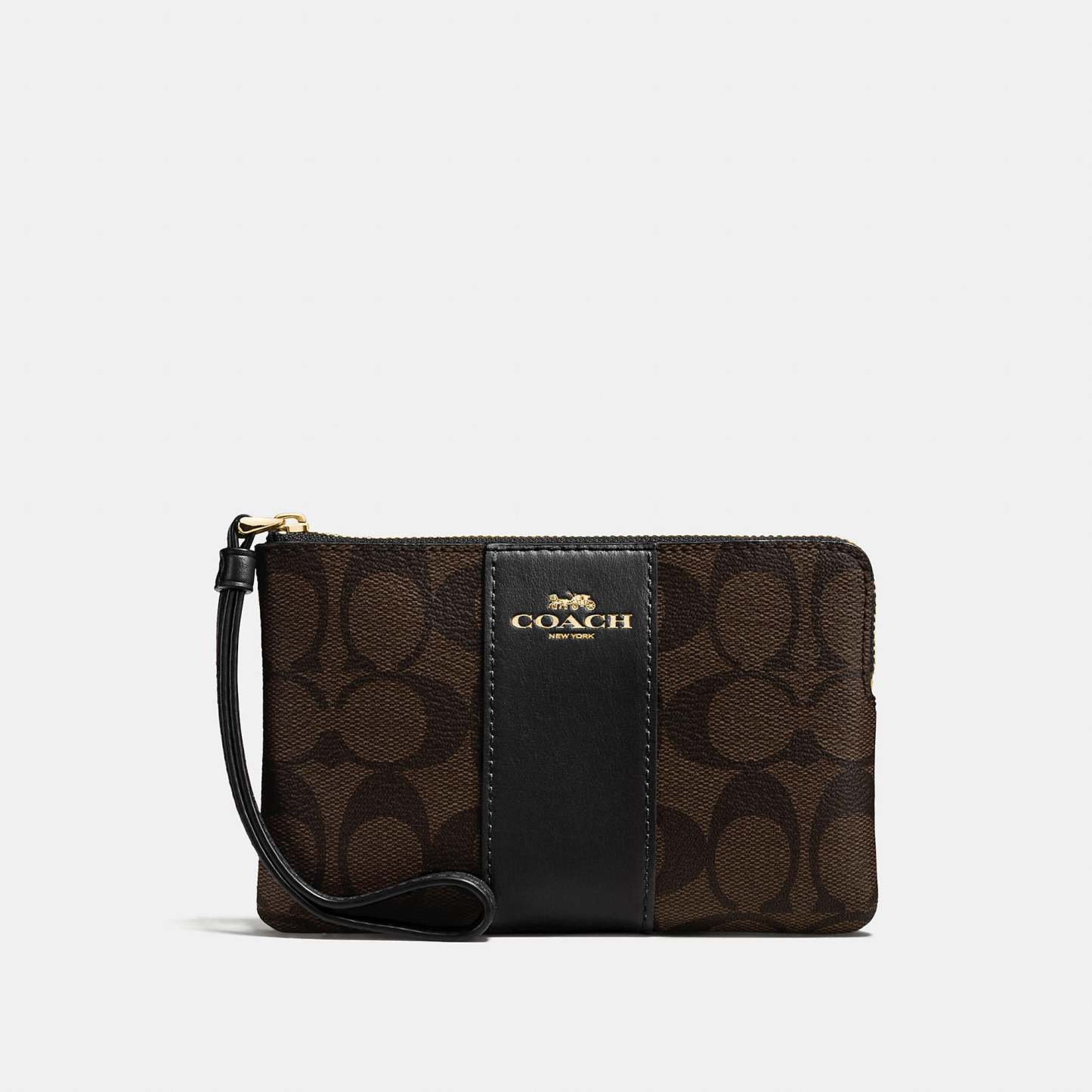 Signature coated canvas with crossgrain leather details Two credit card slots Zip-top closure fabric lining Wrist strap attached 6 1/4 (L) x 4 (H) x 1/2 (W) Style No. 58035