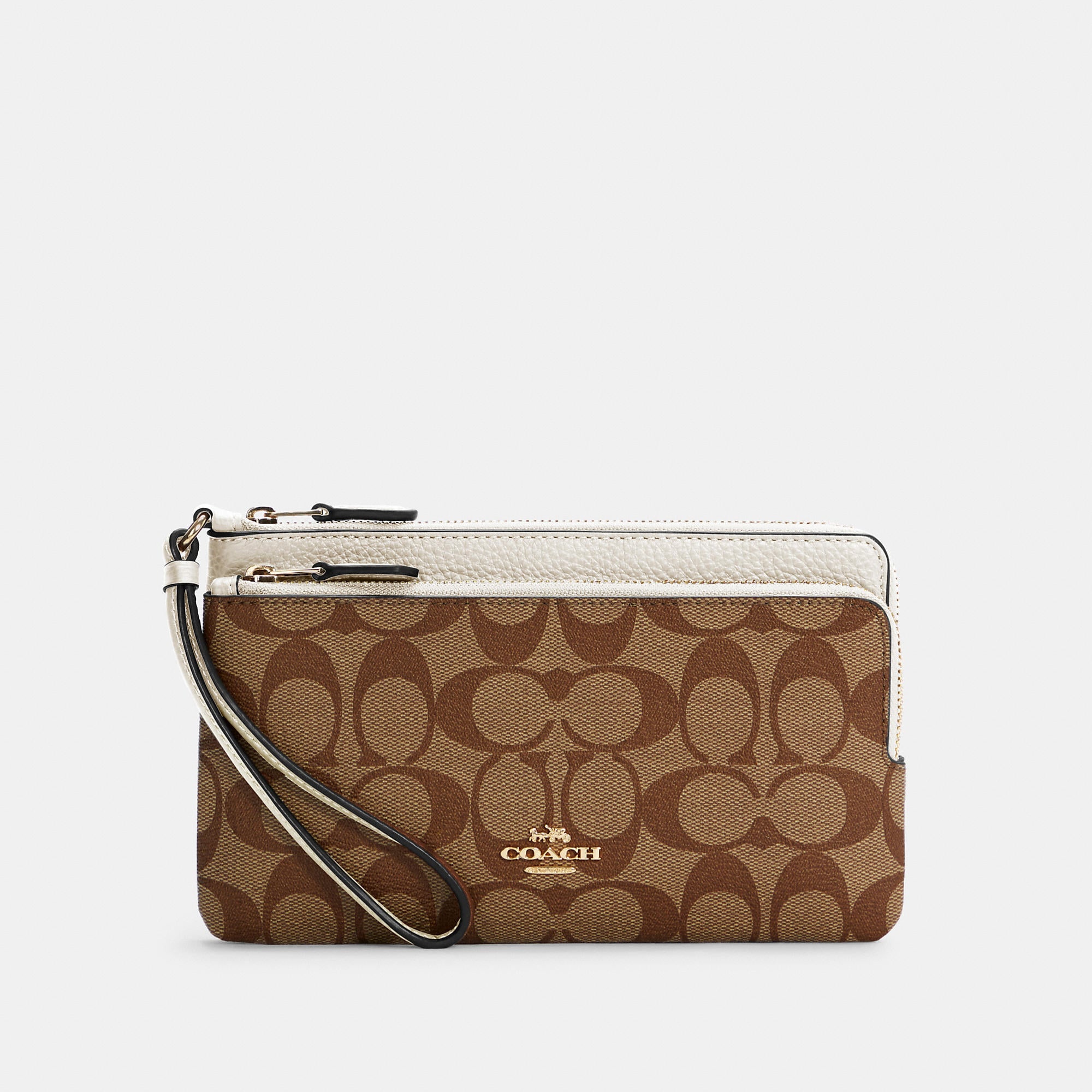 Signature coated canvas and refined pebble leather Eight credit card slots Inside open pockets Double zip closure fabric lining Wrist strap attached 8 (L) x 4 3/4 (H) x 1 (W) Fits all phone sizes up to an iPhone X and Samsung S7 Edge Style No. C5576