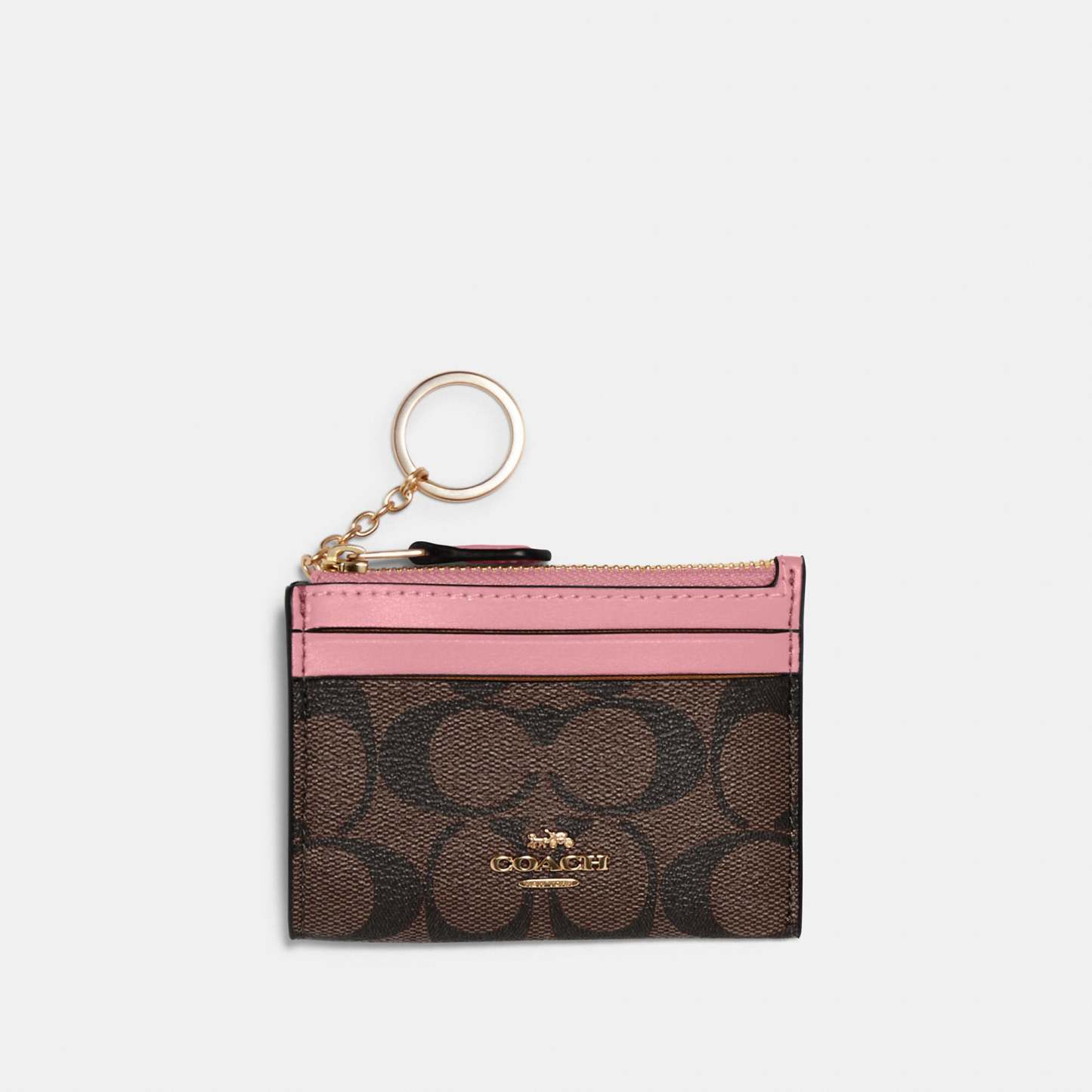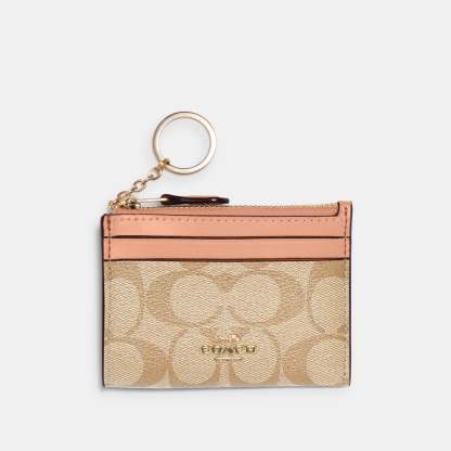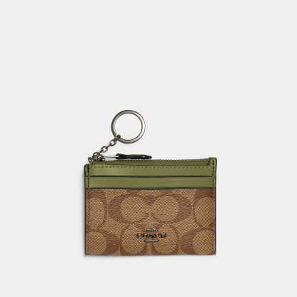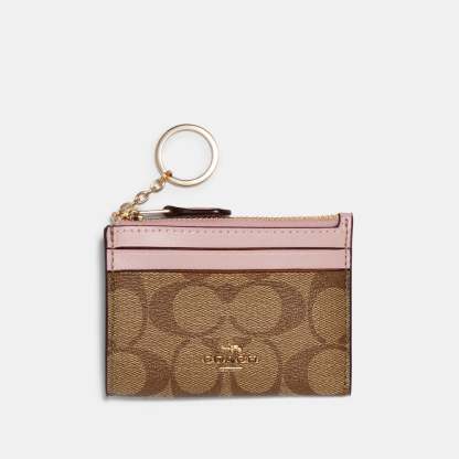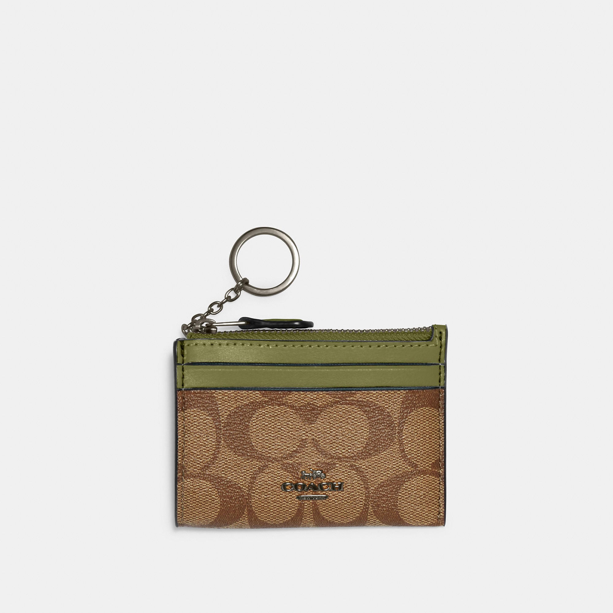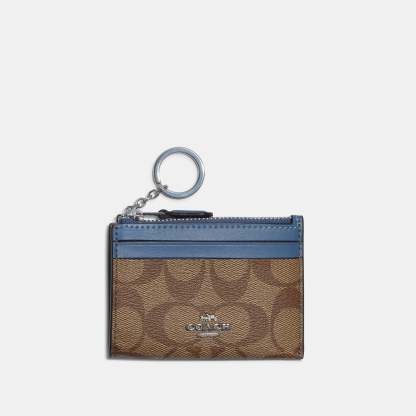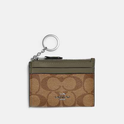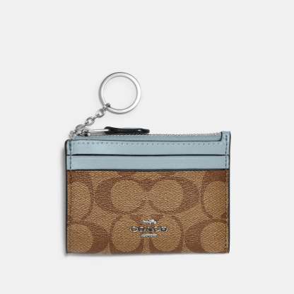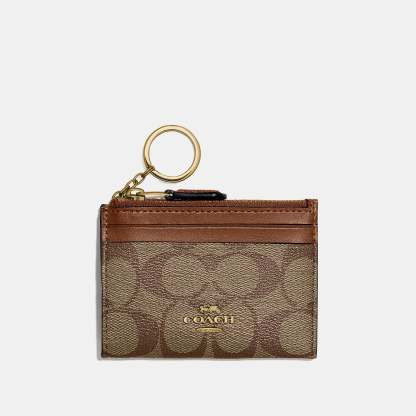 Signature coated canvas and smooth leather Two credit card slots ID window Zip-top closure fabric lining Attached split key ring 4 1/4 (L) x 3 (H) x 1/2 (W) Style No. 88208