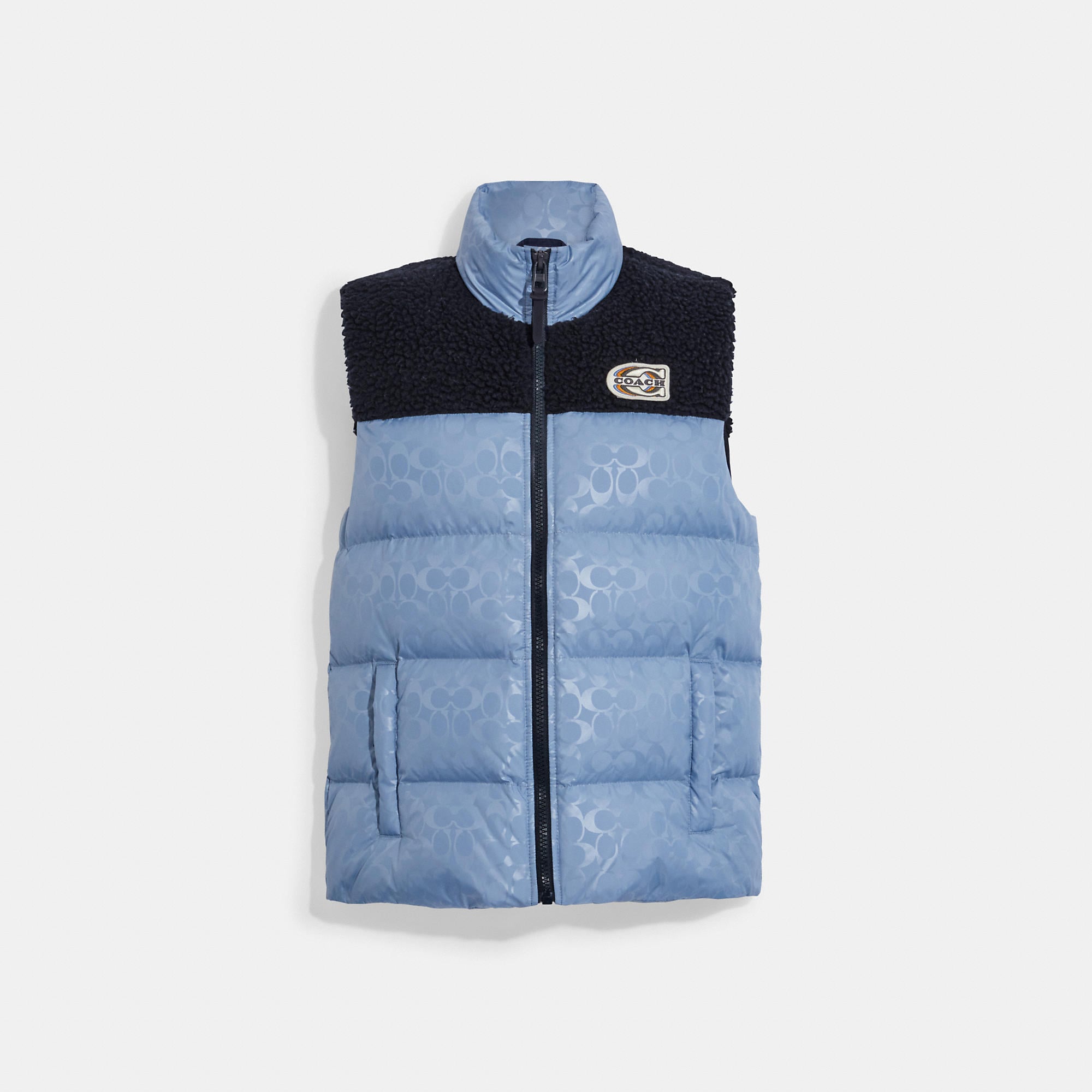 100% polyester Lining - 100% polyester Fill 1 - 90% down 10% feathers Fill 2 - 100% polyester Zip closure Zip pockets Water-resistant Length - 29 1/4 Model is 6'2 (188cm) and wears a size M Style No. CE332 | Outlet Signature Colorblock Sherpa Puffer Vest - Blue, Size - 2X-Large