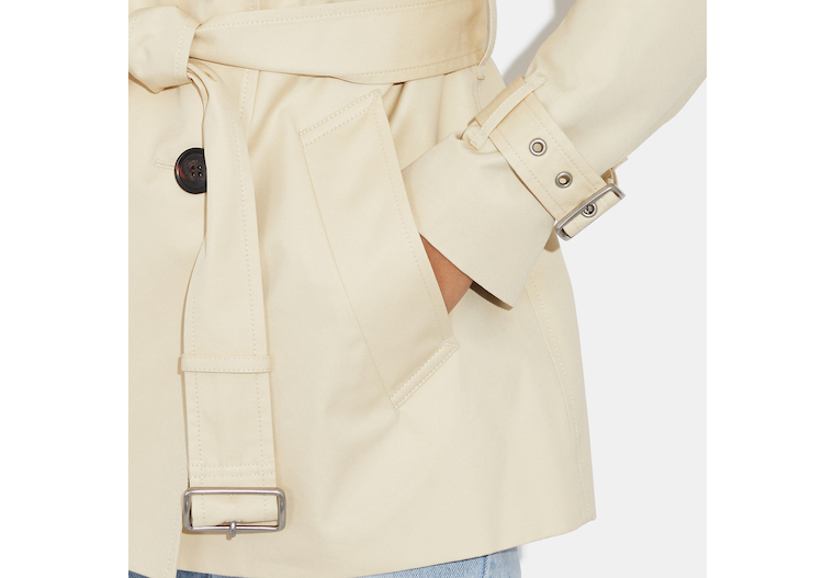 68% cotton 32% polyester Lining - 58% polyester 42% viscose Button closure Slip pockets Adjustable belt Water-resistant Length - 28 1/4 Model is 5'10 (178cm) chest 31 (79cm) waist 24 (61cm) hips 35 (89cm) and wears a size S Style No. CG042 | Outlet Solid Short Trench - Beige, Size - Medium