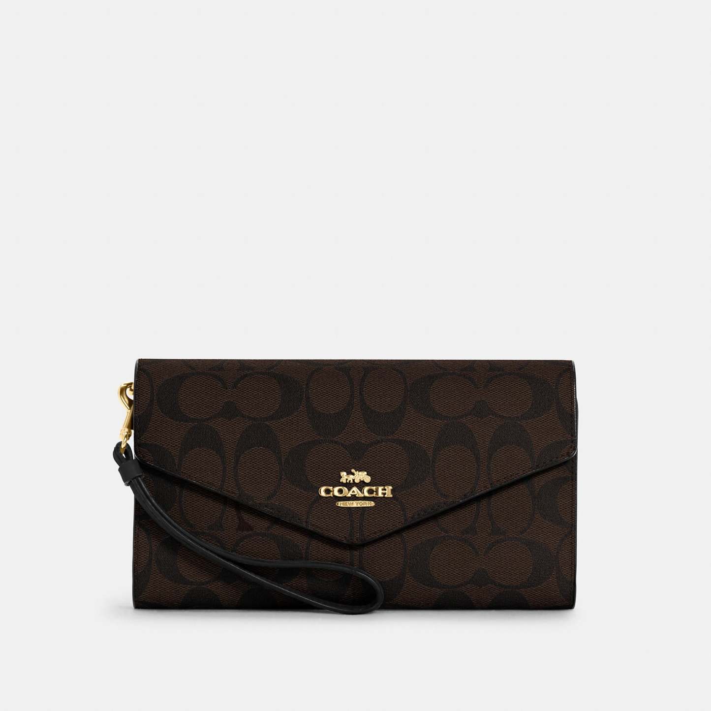 Signature coated canvas and smooth leather Five credit card slots ID window Inside zip and open pockets Snap closure Outside zip coin pocket Detachable wrist strap 8 1/4 (L) x 4 1/2 (H) Style No. C1962
