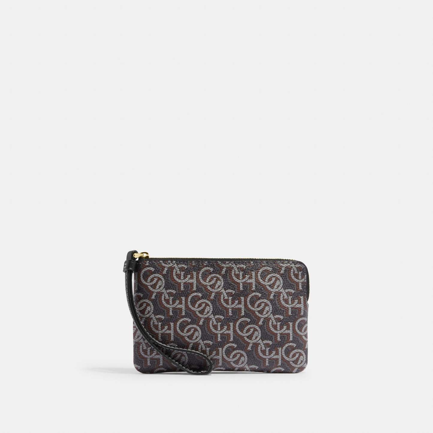 Printed coated canvas and smooth leather Two credit card slots Zip-top closure fabric lining Wrist strap attached 6 1/4 (L) x 4 (H) x 1/2 (W) Style No. CF548 | Outlet Corner Zip Wristlet With Monogram Print - Black