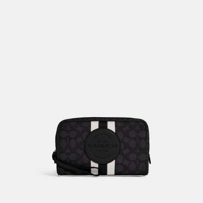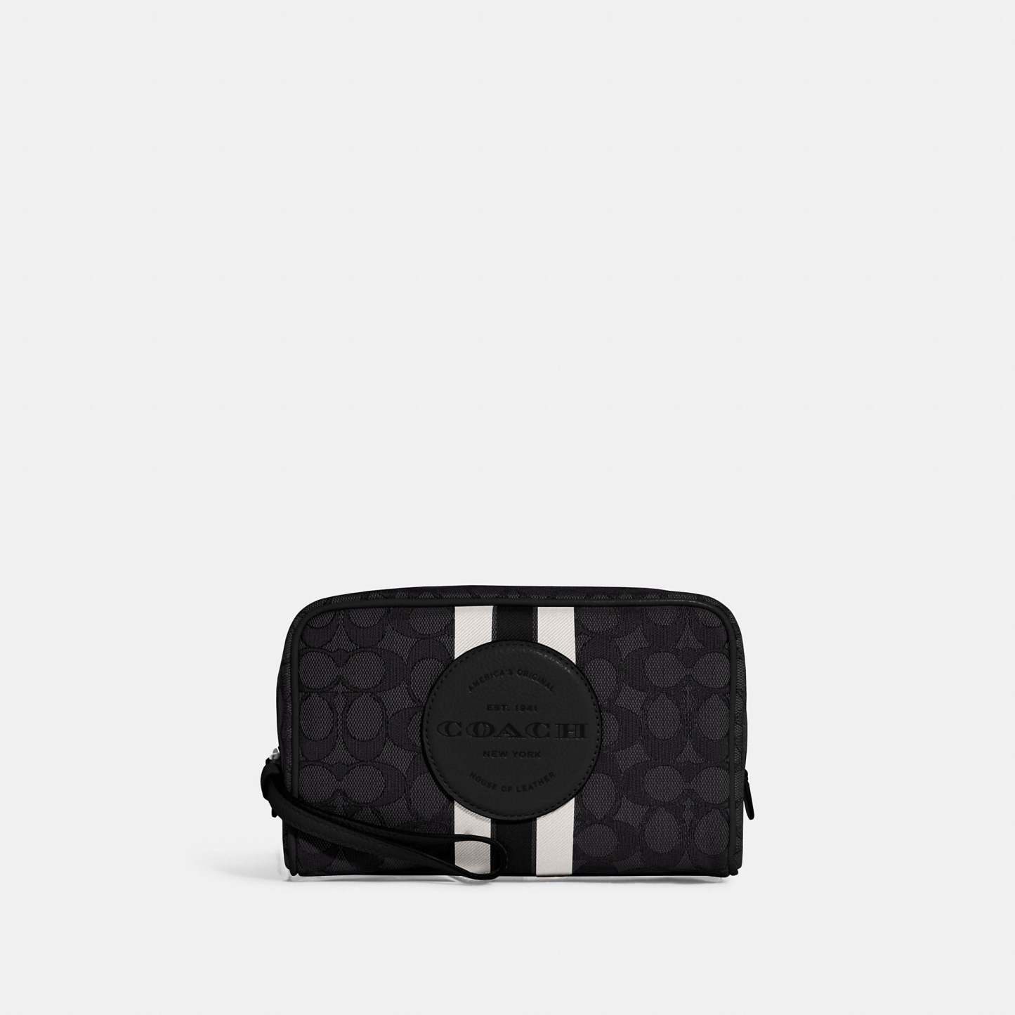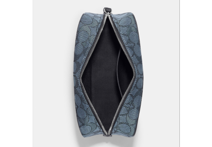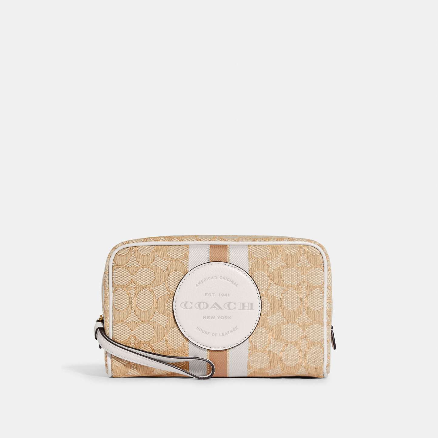 Signature jacquard and refined pebble leather Inside multifunction pocket Zip closure fabric lining Wrist strap attached 7 3/4 (L) x 4 3/4 (H) x 2 3/4 (W) This piece is crafted of our Signature jacquard made from a blend of organic cotton and recycled polyester Style No. C9119 | Outlet Dempsey Boxy Cosmetic Case 20 In Signature Jacquard With Stripe And Patch - Blue