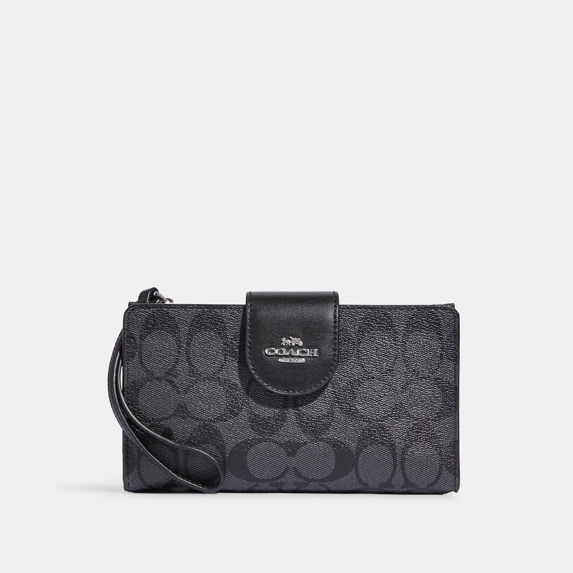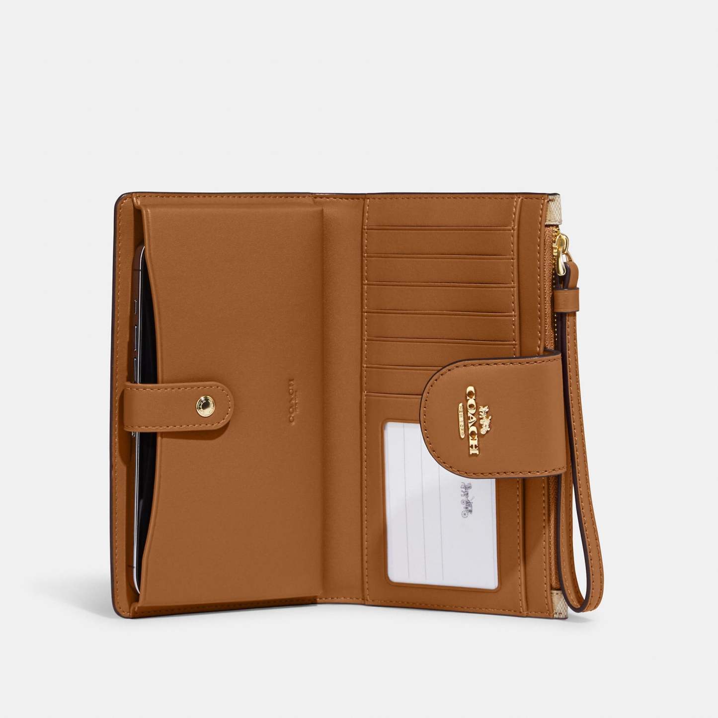 Signature coated canvas and smooth leather Six credit card slots ID window Snap phone compartment Snap closure Outside zip pocket Attached wrist strap 7 1/4 (L) x 4 1/2 (H) Fits all iPhone and Samsung Galaxy phones Style No. C2874 | Outlet Tech Wallet In Colorblock Signature Canvas - Beige