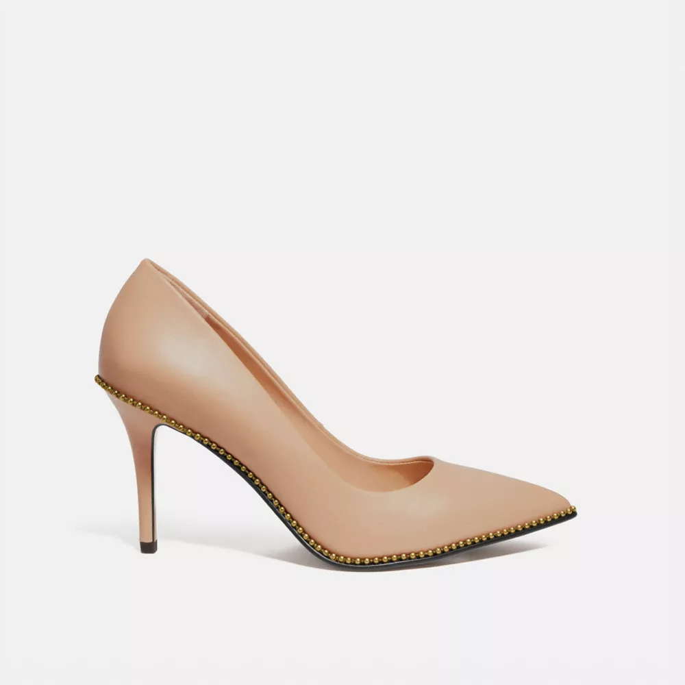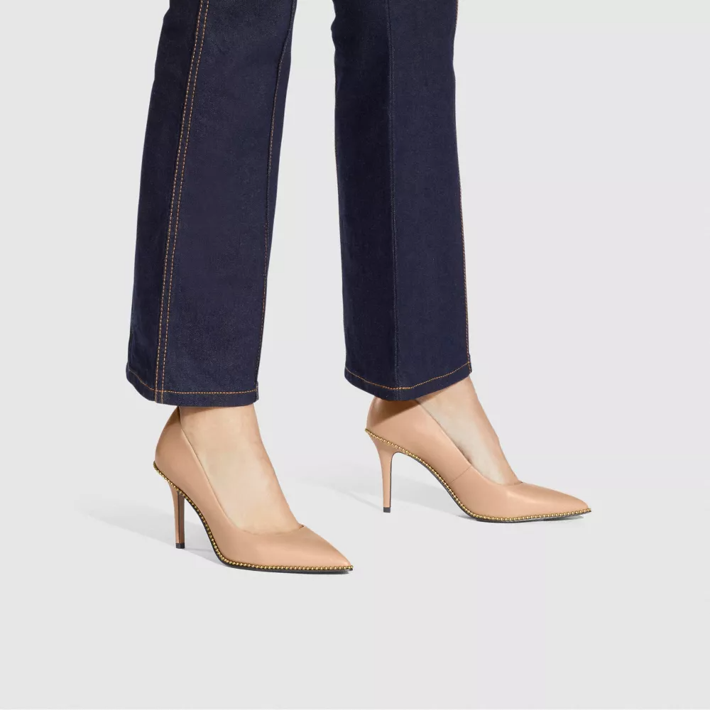 Crafted in smooth leather, this versatile pump is perfect for day or night. Gleaming beadchain detail gives the pointed-toe style a touch of shine.