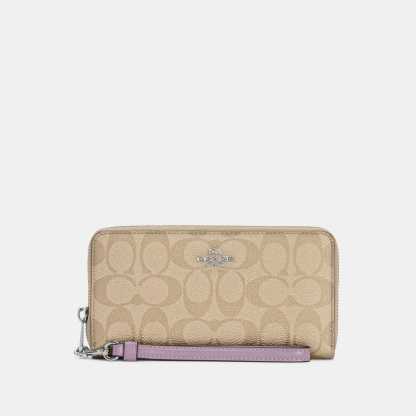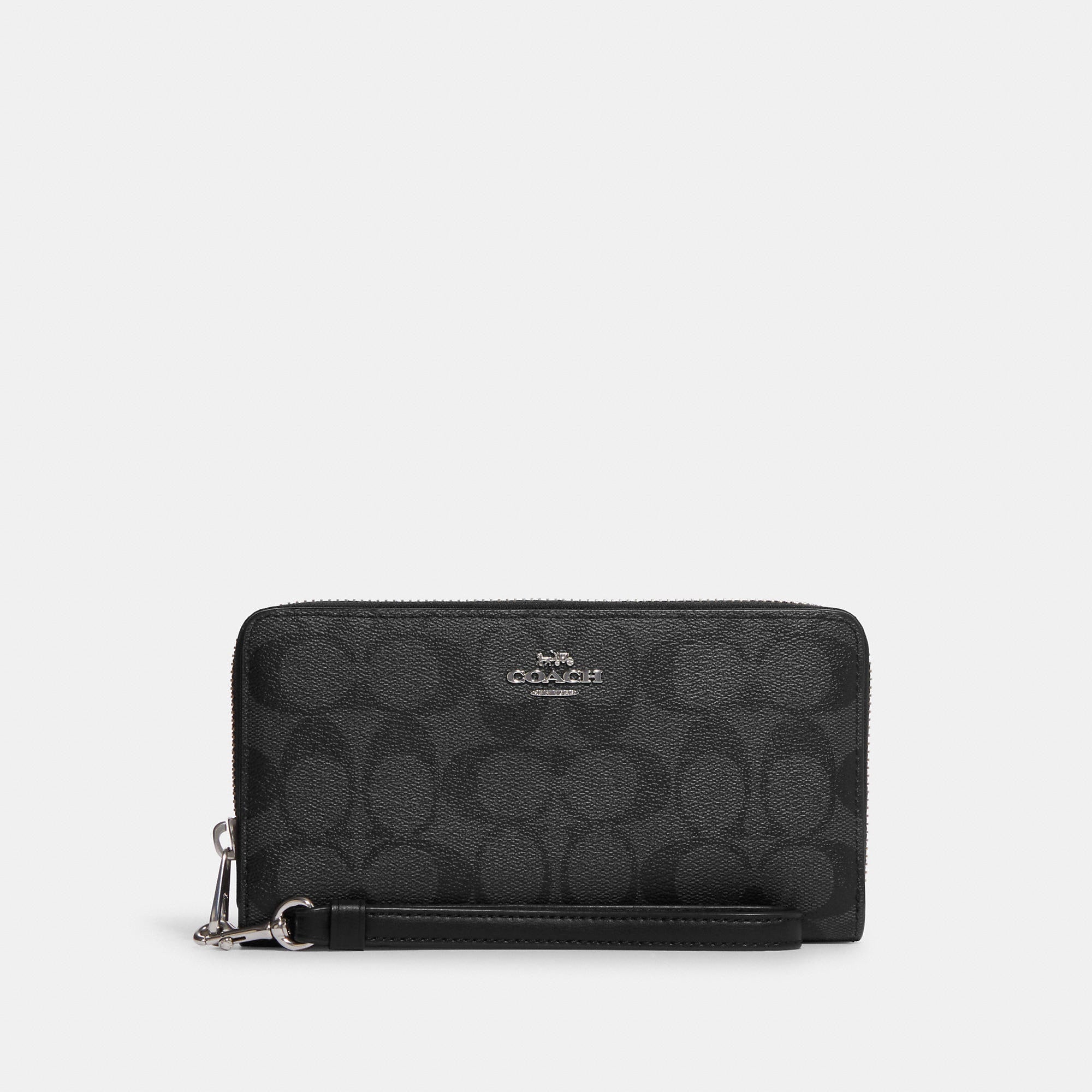 Signature coated canvas and smooth leather Twelve credit card slots Full-length bill compartments Inside zip coin pocket Zip-around closure Detachable wrist strap 7 1/2 (L) x 4 (H) x 1 (W) Fits all iPhone and Samsung Galaxy phones Style No. C4452