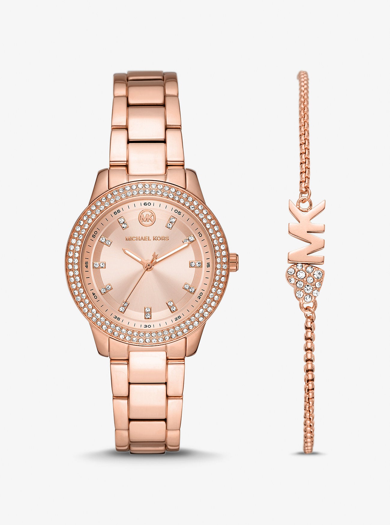 For gifts that leave a lasting impression, look no further than this covetable set. The mini Tibby showcases a timeless stainless-steel design with sparkling pav stones for a dazzling update. It paired with a rose gold-tone slider bracelet that features a logo-and-pav heart charm for a stylish and elegant finish. | Watch and bracelet set