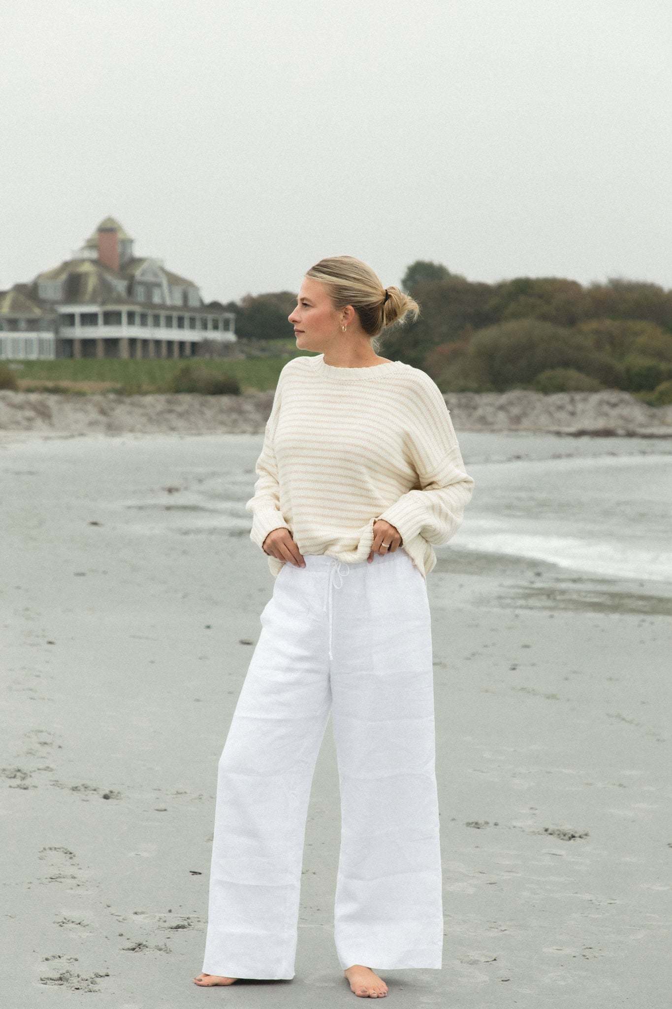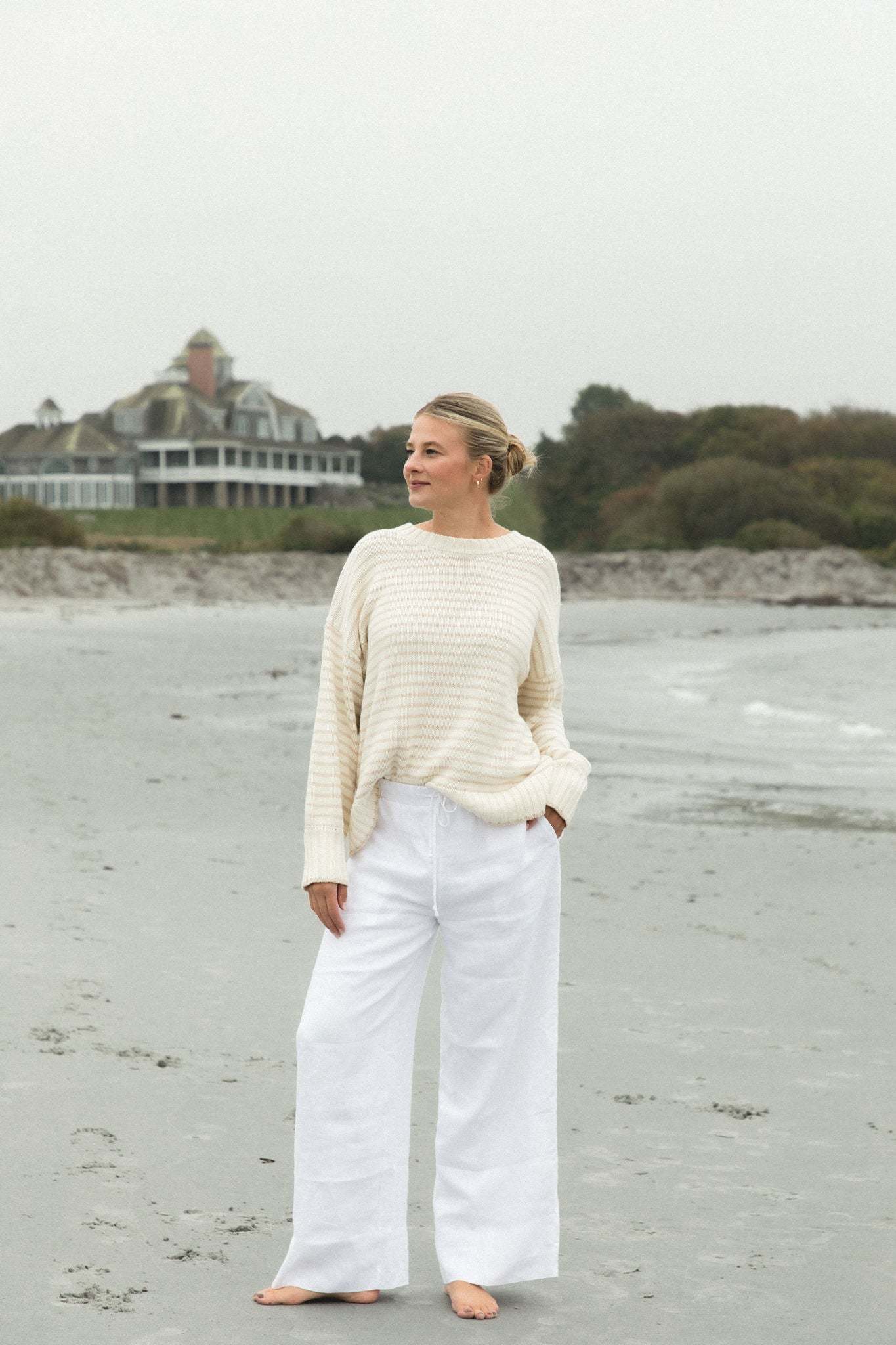 Cozy up in the Beachcomber Oversized Knit Striped Sweater. This cream sweater, accented with soft taupe stripes, offers a relaxed, oversized silhouette that��s perfect for breezy days by the coast or laid-back evenings. With its effortless style and timeless appeal, it��s a go-to piece for bringing coastal warmth and understated elegance to any outfit.