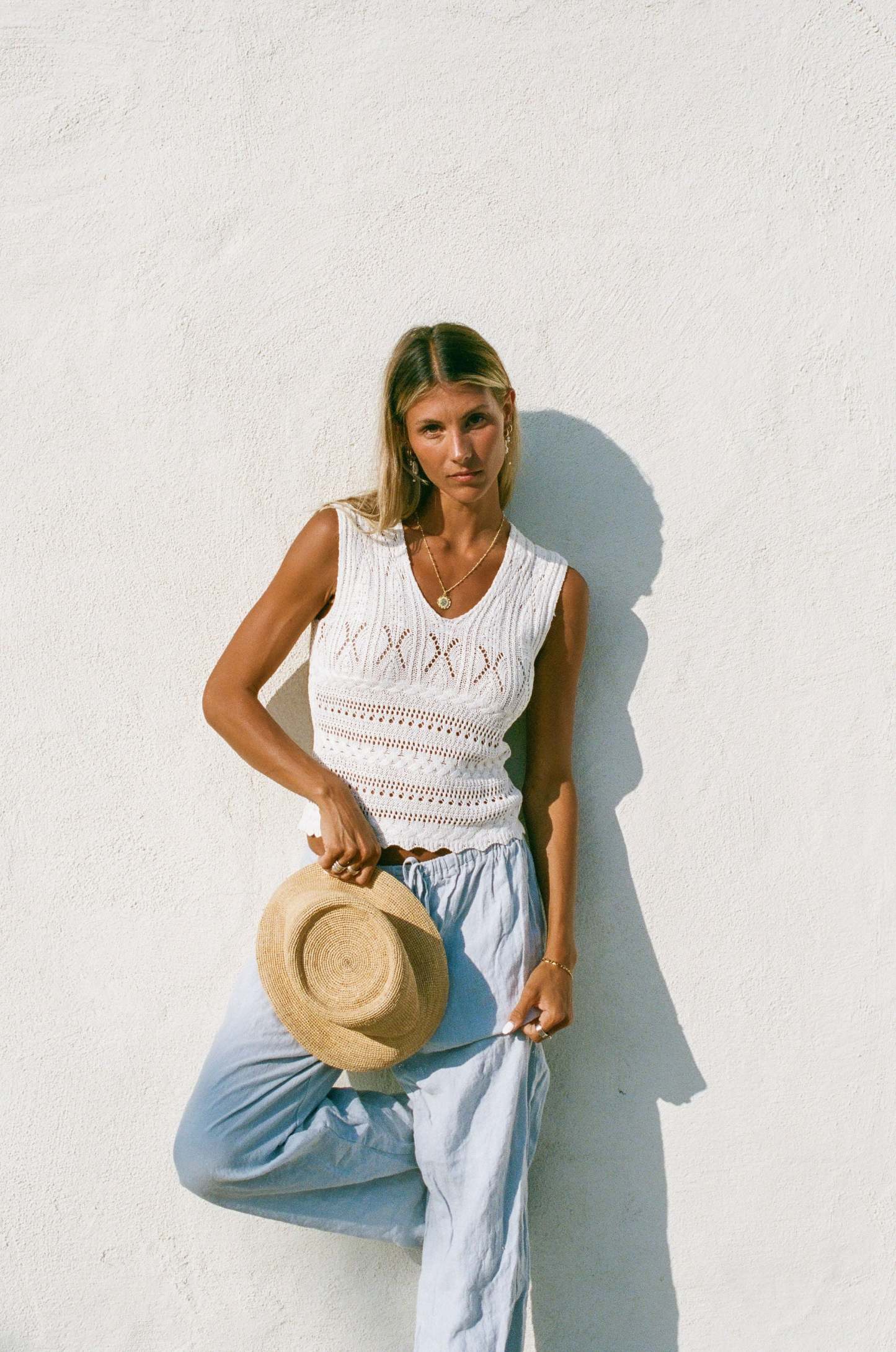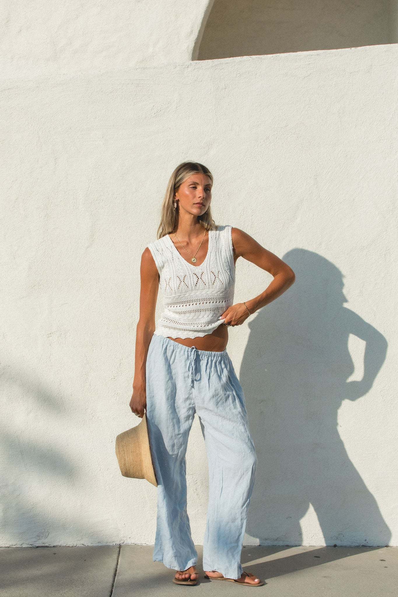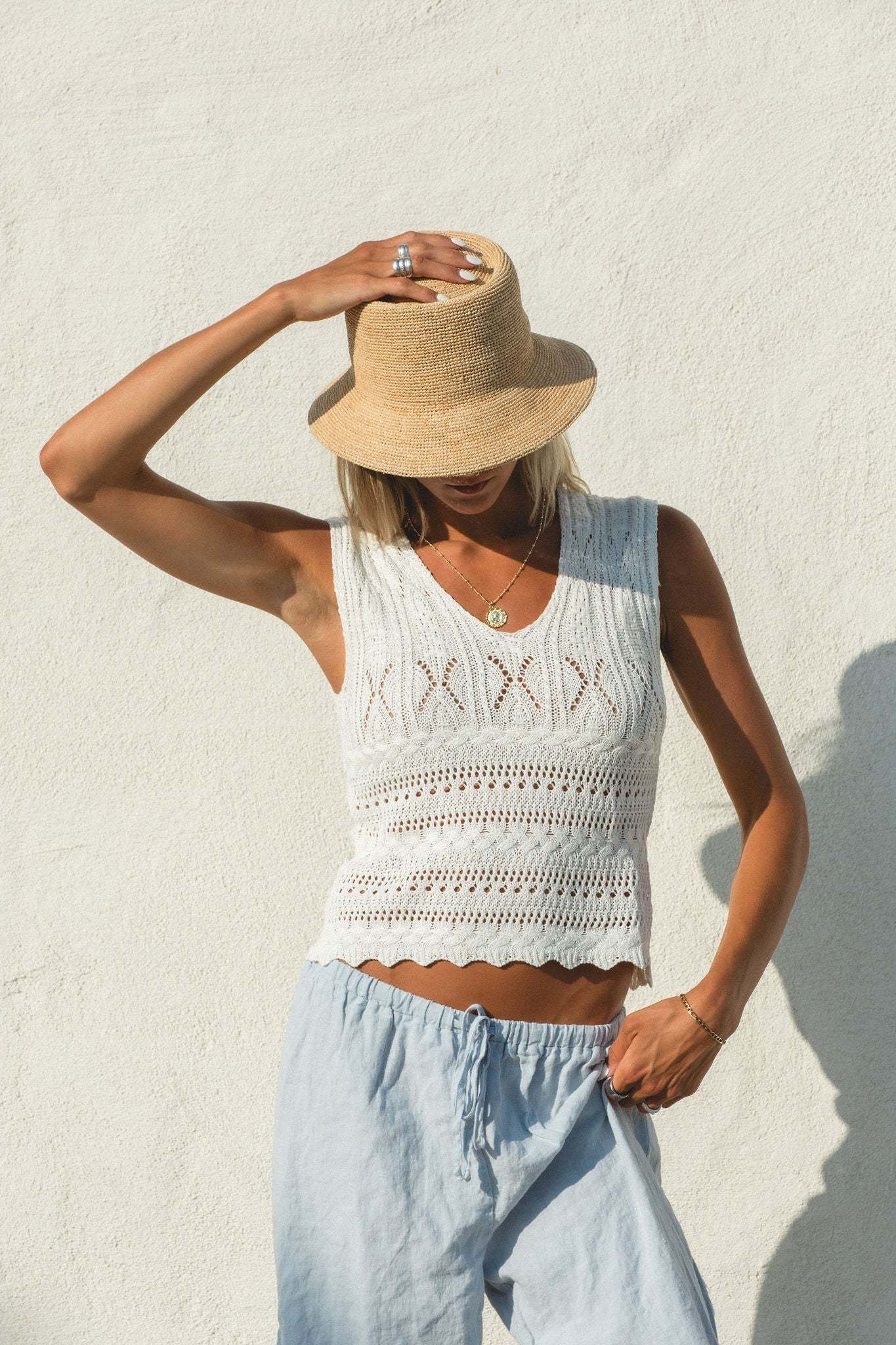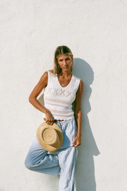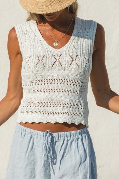 Expertly crafted with a knit and crochet design, the Dahlia Sleeveless Top exudes effortless style. The v-neck and sleeveless features provide a timeless look, while the true white color complements any wardrobe.