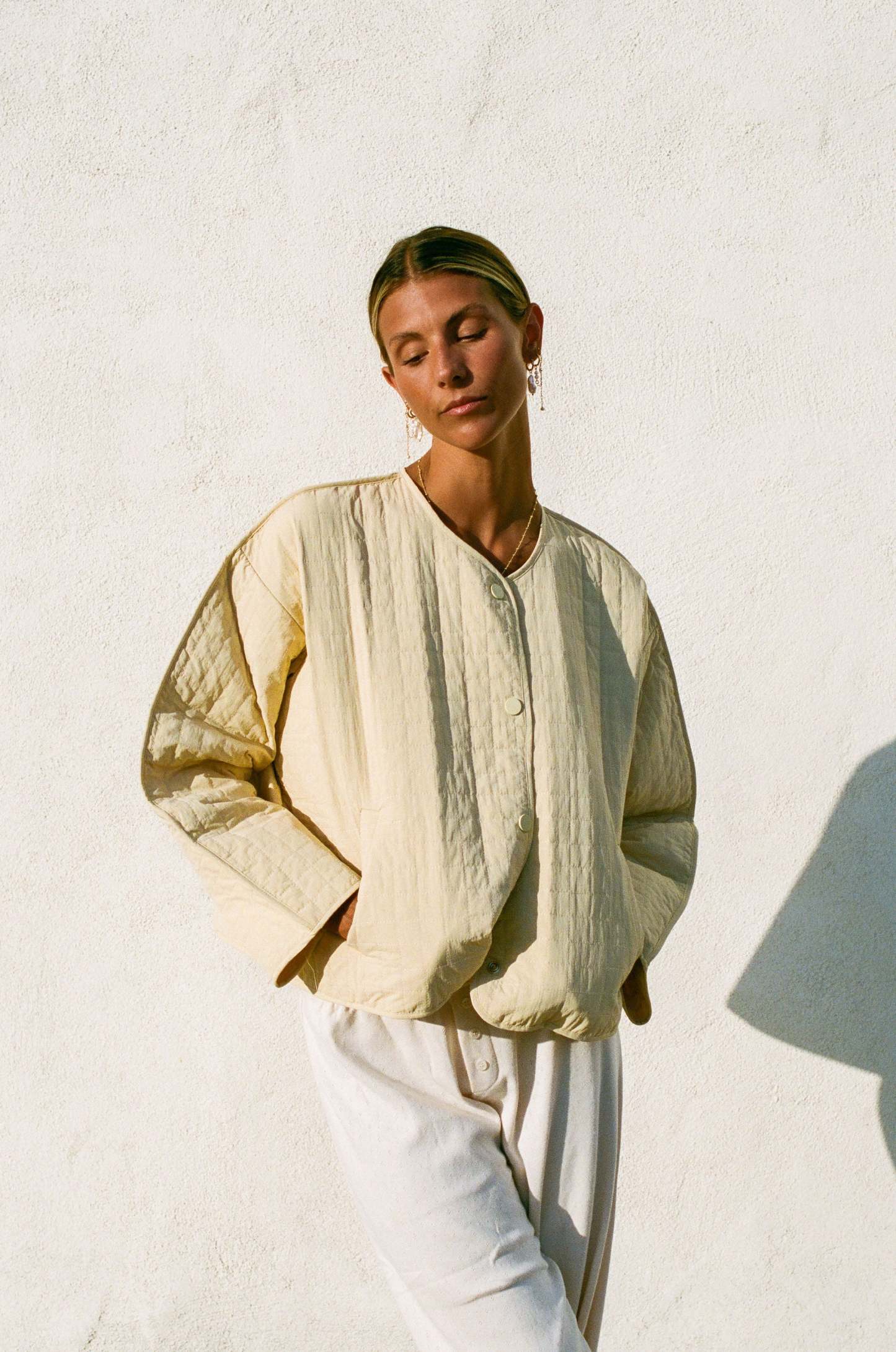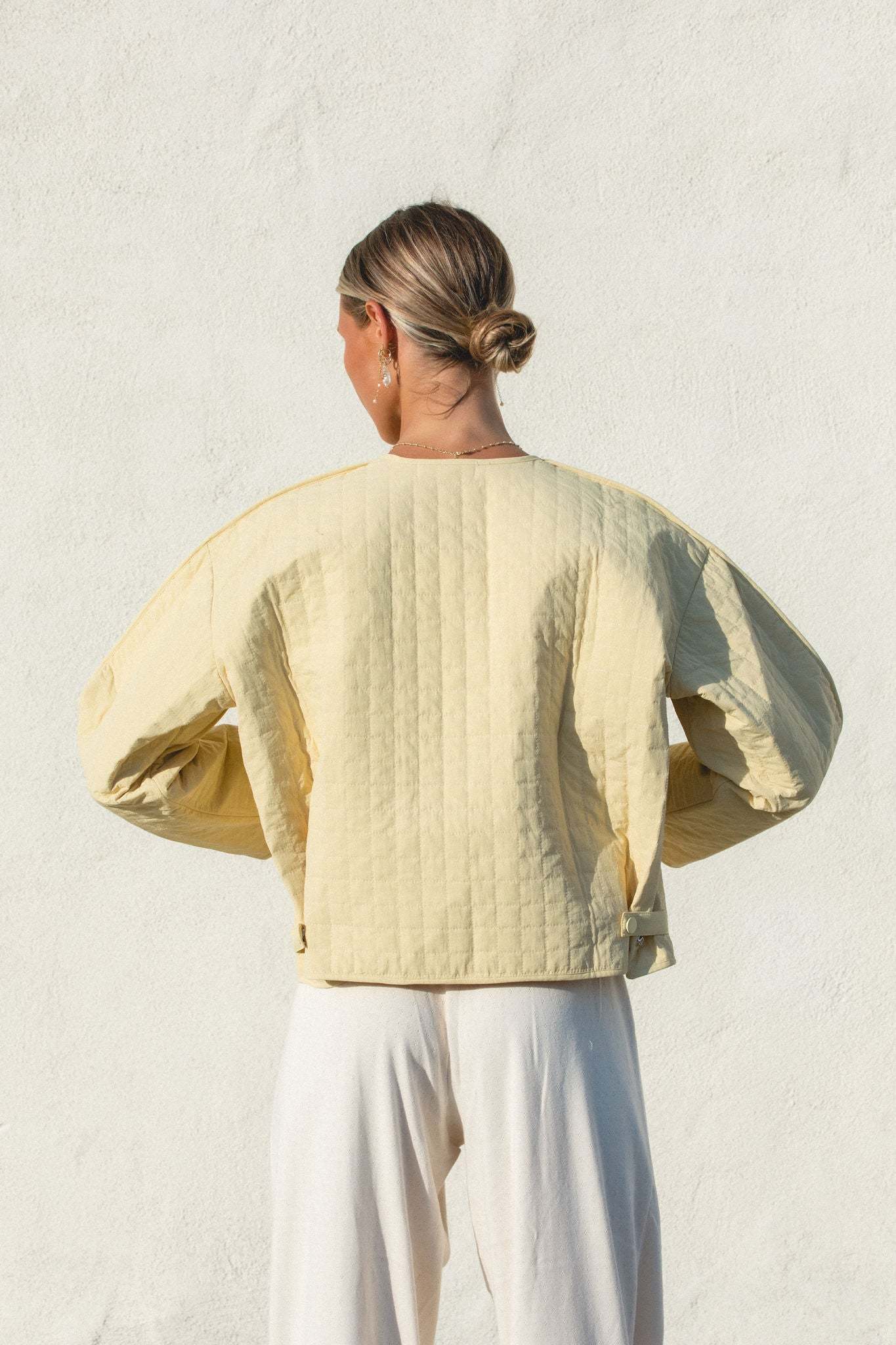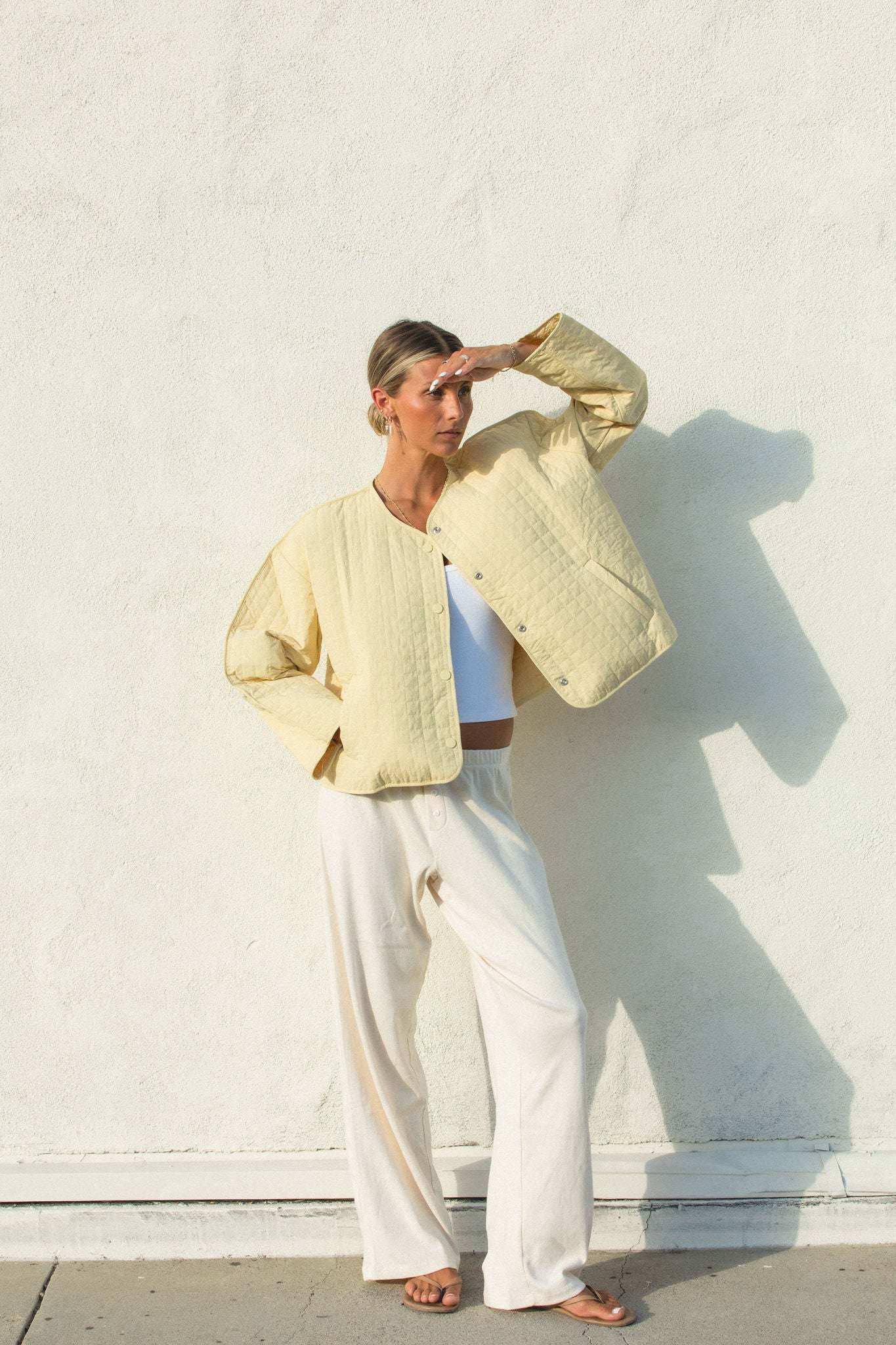 This quilted jacket is the perfect combo of structured yet easy. Wear unbuttoned with a tank under button up for those cooler outings. Available in the color of the season, lemon yellow.