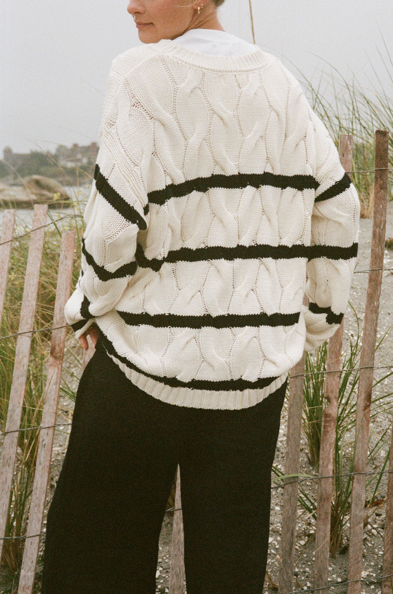 Crafted in an ivory cable knit with a bold black horizontal stripe, this sweater offers a relaxed, oversized fit perfect for layering on cooler days. Its timeless design and soft, textured knit bring effortless coastal charm to any look, whether you��re by the shore or city-bound.