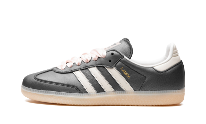 The Women's adithtdas Samba OG "Black/Beige/Pink" is a women's-exclusive colorway of the retro indoor soccer shoe with an easy-wearing look. The upper features a black leather design with a tonal leather overlay on the toe. Contrasting light pink leather Three Stripes branding can be seen on both sides, while more light pink leather appears on the heel. Pink ribbon-style laces give the shoe an eye-catching look. A semi-translucent pinkish-beige rubber sole finishes off the design. Black Beige Pink