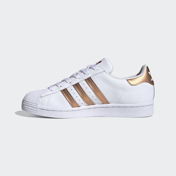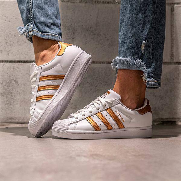 Go ahead. Put on your gold hoops and your fanciest jumpsuit. Tonight you're gonna sparkle. adthtidas Superstar Shoes have been a symbol of self expression for over 50 years. This pair carries on the tradition with golden details that are anything but dull. So lace up in glitzy glam and let your true self shine.