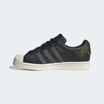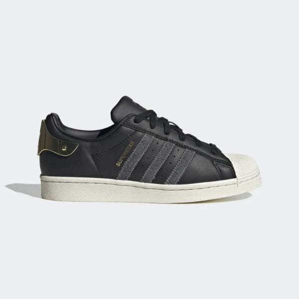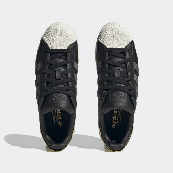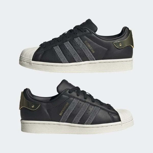Retro revamped. Vintage-inspired and iconic, these adthtidas Superstar shoes are a streetwear staple you'll reach for time and time again. A pioneer since the '70s, the trainer began on the cutting edge of basketball and soon found itself on the forefront of fashion. A detachable metal heel patch brings a glamorous touch to this version of the classic. The rubber shell toe and cupsole keep it authentic adthtidas.