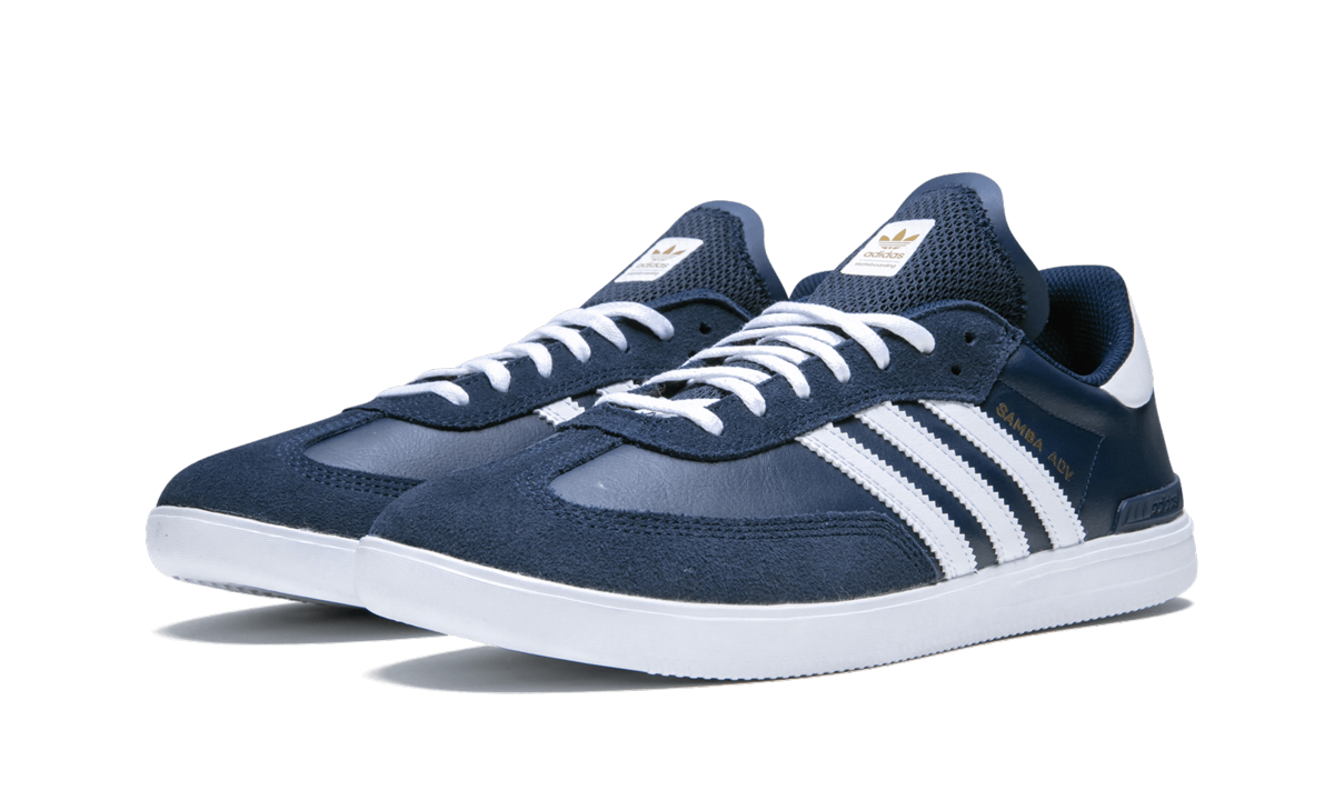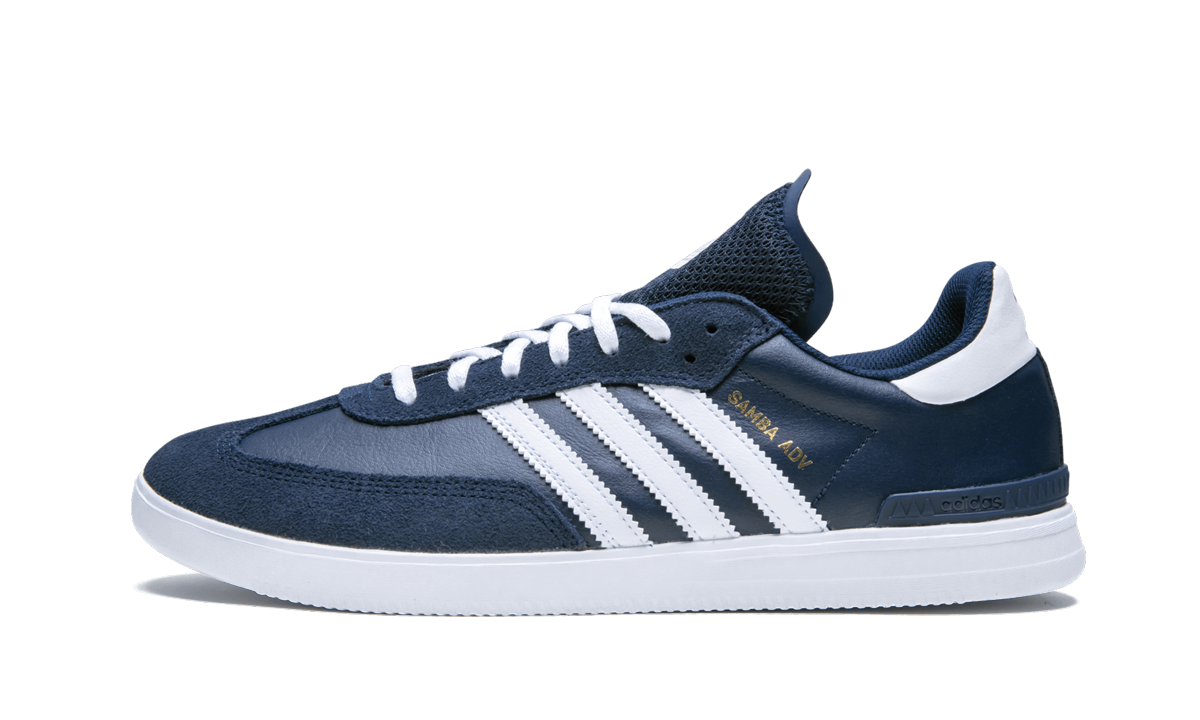 The adithtdas Samba ADV is a tweaked iteration of the classic low-top silhouette improved for skateboarding. A leather upper features suede overlays on the eyelets and toe. Improvements include reinforced high impact areas, a non-slip mesh tongue, exposed Bounce cushioning in the midsole, and a Geoflex outsole. This colorway of the adithtdas Samba ADV sports a navy blue upper with white detailing on the Three Stripes, tongue label, heel tab, and midsole. Gold branding hits appear on the side panel, tongue, and heel.