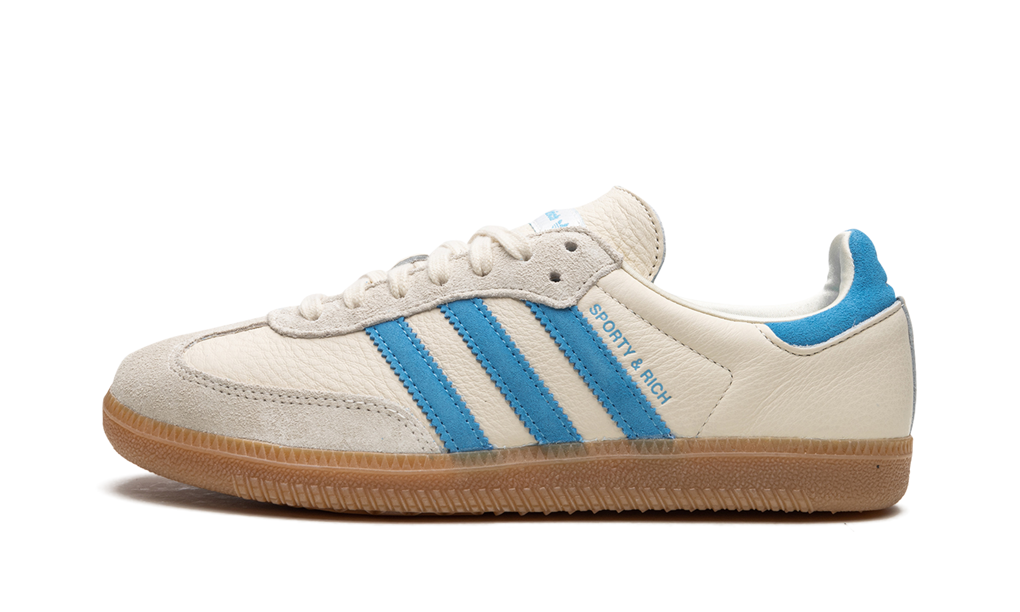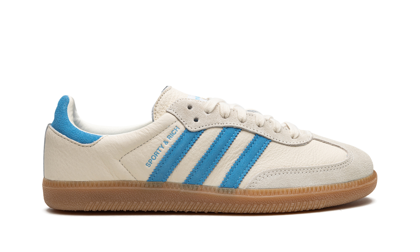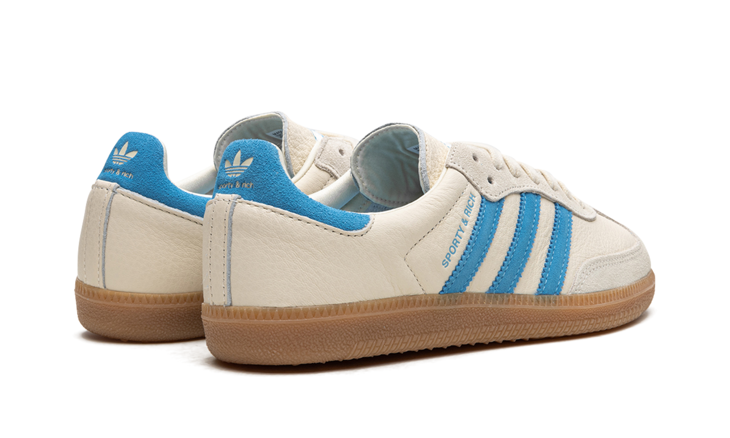 The Sporty and Rich x Women's adithtdas Samba "Cream/Blue" is a women's-exclusive colorway of the popular retro indoor soccer model from the collaboration by Emily Oberg's sportswear brand. The Sporty and Rich Samba features a cream leather construction with a tonal suede toe overlay. A blue suede Three Stripes logo is found on the sides next to a blue "Sporty and Rich" logo. Dual "adithtdas" and "Sporty and Rich" detailing appears on the heel tab. Classic adithtdas Samba branding is located on the tongue. A gum rubber sole completes the clean design. Release date: May 4, 2023 Sporty & Rich - Cream Blue