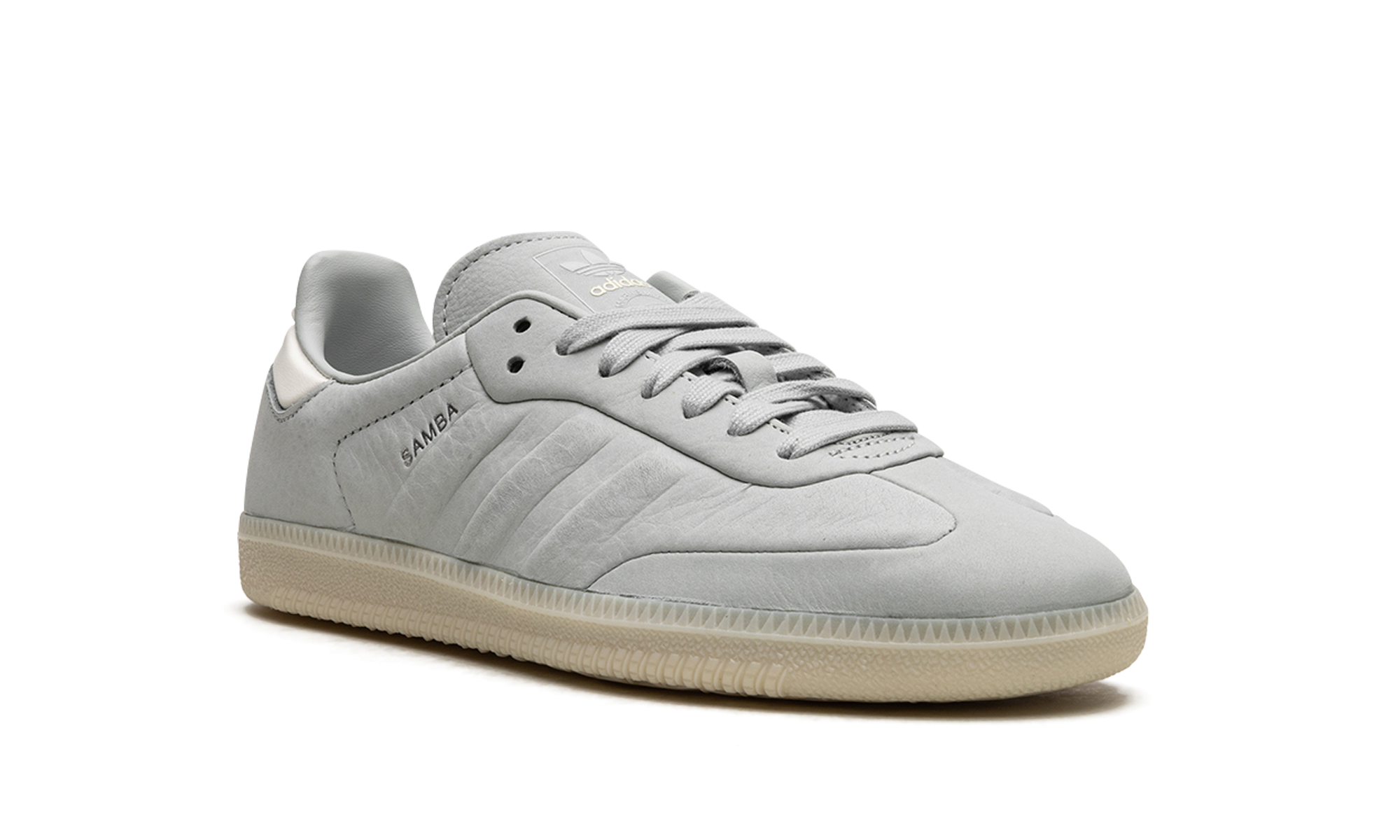 The adithtdas Samba "Wonder Silver" is a minimalist colorway on the retro indoor soccer sneaker with a unique design. The colorway features a Wonder Silver-colored leather construction with tonal Three Stripes on the sides and tonal overlays on the toe and forefoot. "Samba" branding appears next to the raised Three Stripes logo on the lateral side of the shoe. Debossed "adithtdas" detailing appears on the tongue. A semi-translucent gum rubber sole completes the look of the versatile and casual colorway. Samba