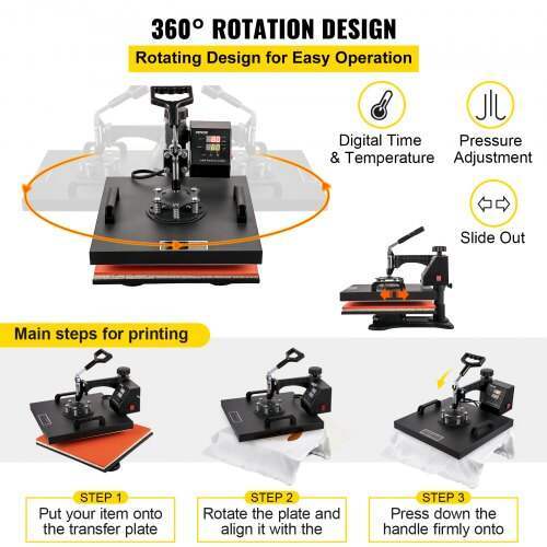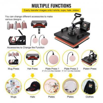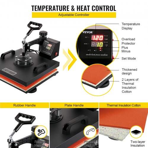 - PRACTICAL ORDER DIGITAL: The LCD screen and its intuitive buttons allow for easy adjustment of the desired settings. An audible alarm alerts you when the machine automatically shuts off once the set time and temperature have been reached. 360° FUNCTION: The pivoting arm rotates a full 360°, allowing the heating element to move laterally and thus reducing the risk of accidental contact. Pressure is applied directly and evenly. Applying downward pressure further improves transmission quality. ADJUSTABLE SPRING-LOADED PLATE: The adjustable spring-loaded platen is compatible with various accessories, such as a mug press or a cap press. It is quick and easy to assemble. Its rounded shape ensures even pressure distribution. USER COMFORT: The improved handles offer a better grip and greater stability. Composed of two layers of heat-resistant wadding, 4 mm thick aluminum silicate paper insulation, and a durable sponge. With its 10mm thickness, this heat press improves heat transfer. Versatile 8-in-1 kit: includes a large 38 x 38 cm (15 x 15 inch) heat press with a non-stick, stable, Teflon-coated plate. Ideal for applying letters, numbers and designs to hats, t-shirts, mugs, plates, etc.