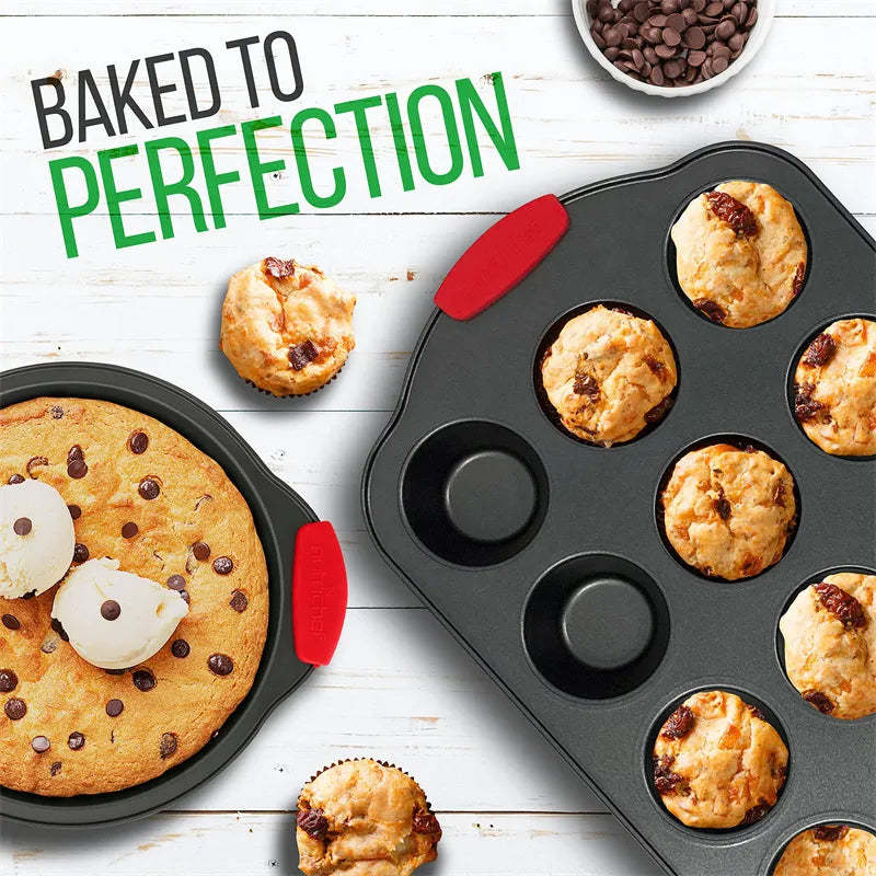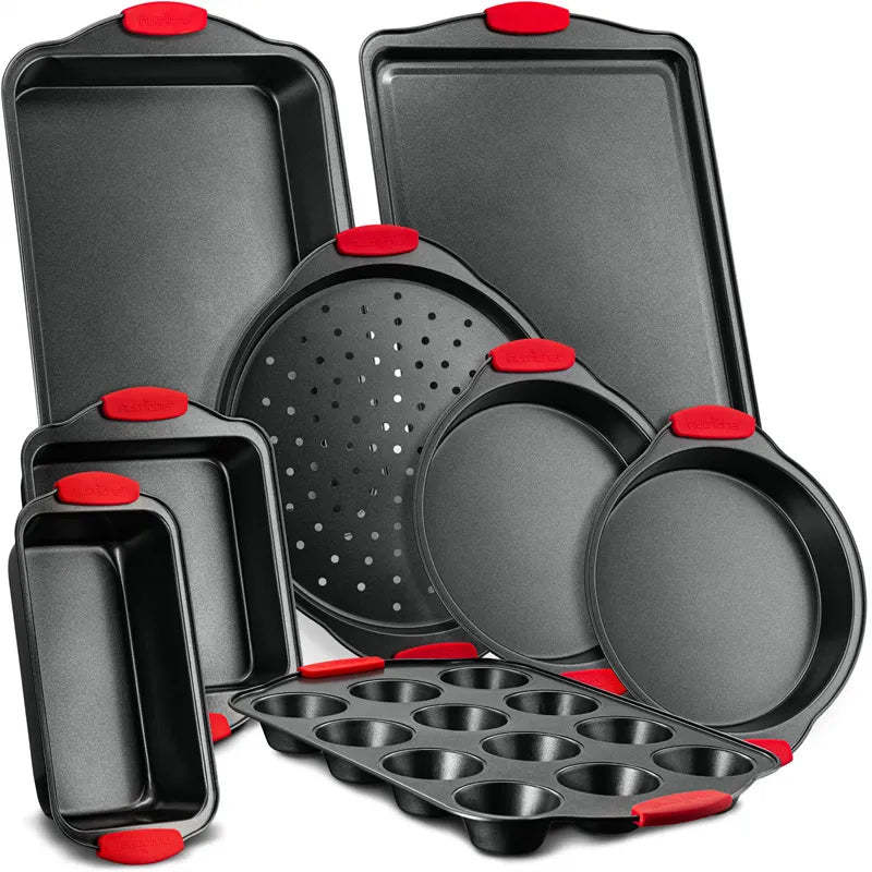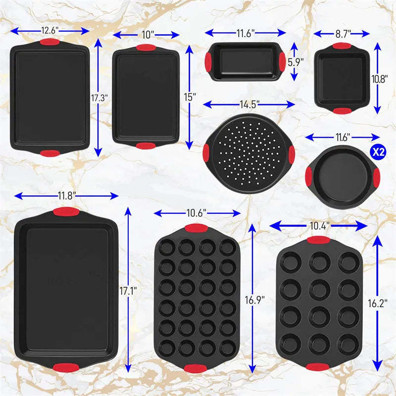 - 21 PIECE SET: Includes 1.5 & 2.5L saucepans with lids, 4.5L Dutch oven with lids, small/medium frypans with handles, ladle, spoon, small & regular spatula, silicone brush, muffin tin, loaf tin, 2 rounds Skillet, Square Pan, Frying Pan, Pizza Pan & Baking Pan