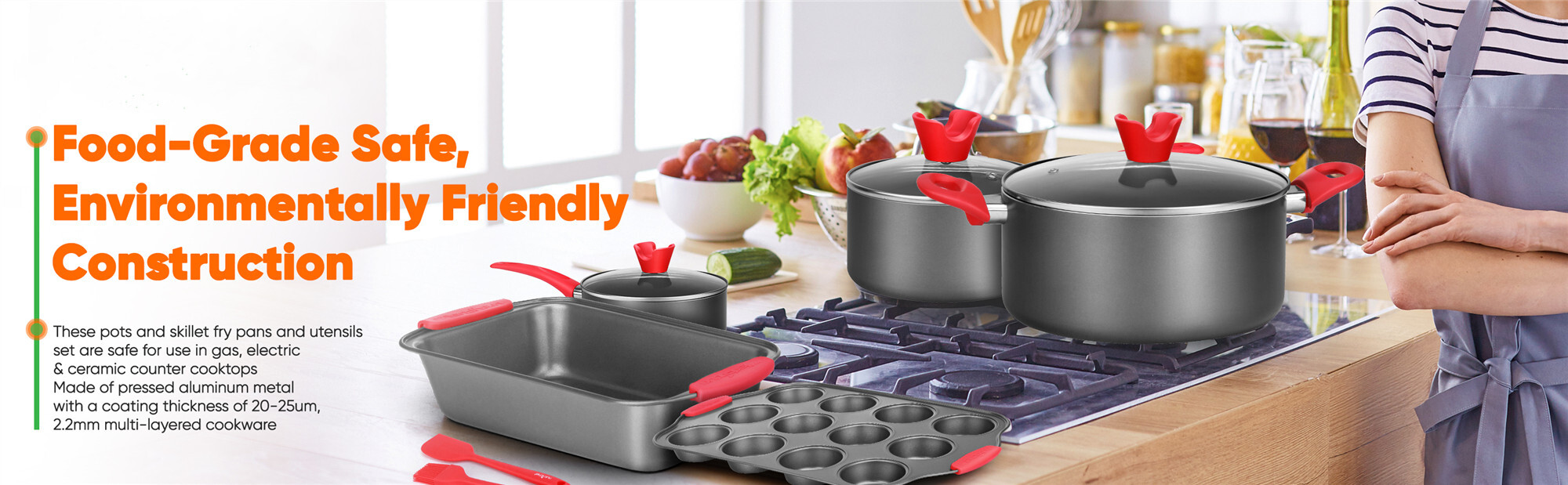 - UNIVERSAL COOKING: These pots and pans and utensil set are safe for use on gas, electric and ceramic hobs. Made of pressed aluminum metal with a coating thickness of 20-25um, 2.2mm multi-layer cookware