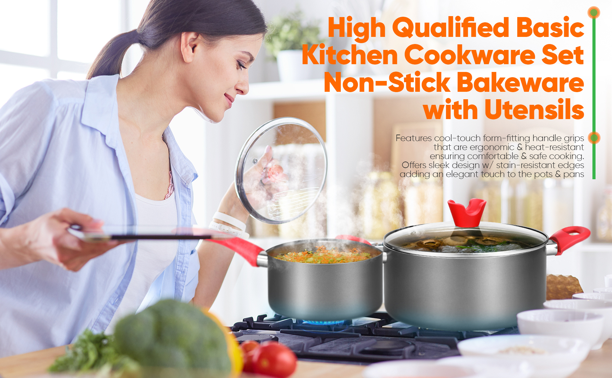 - COMFORTABLE HANDLES: Features form-fitting cool-touch handles that are ergonomic and heat-resistant for comfortable and safe cooking. Offers a sleek design with stain-resistant edges that add an elegant touch to the pots and pans