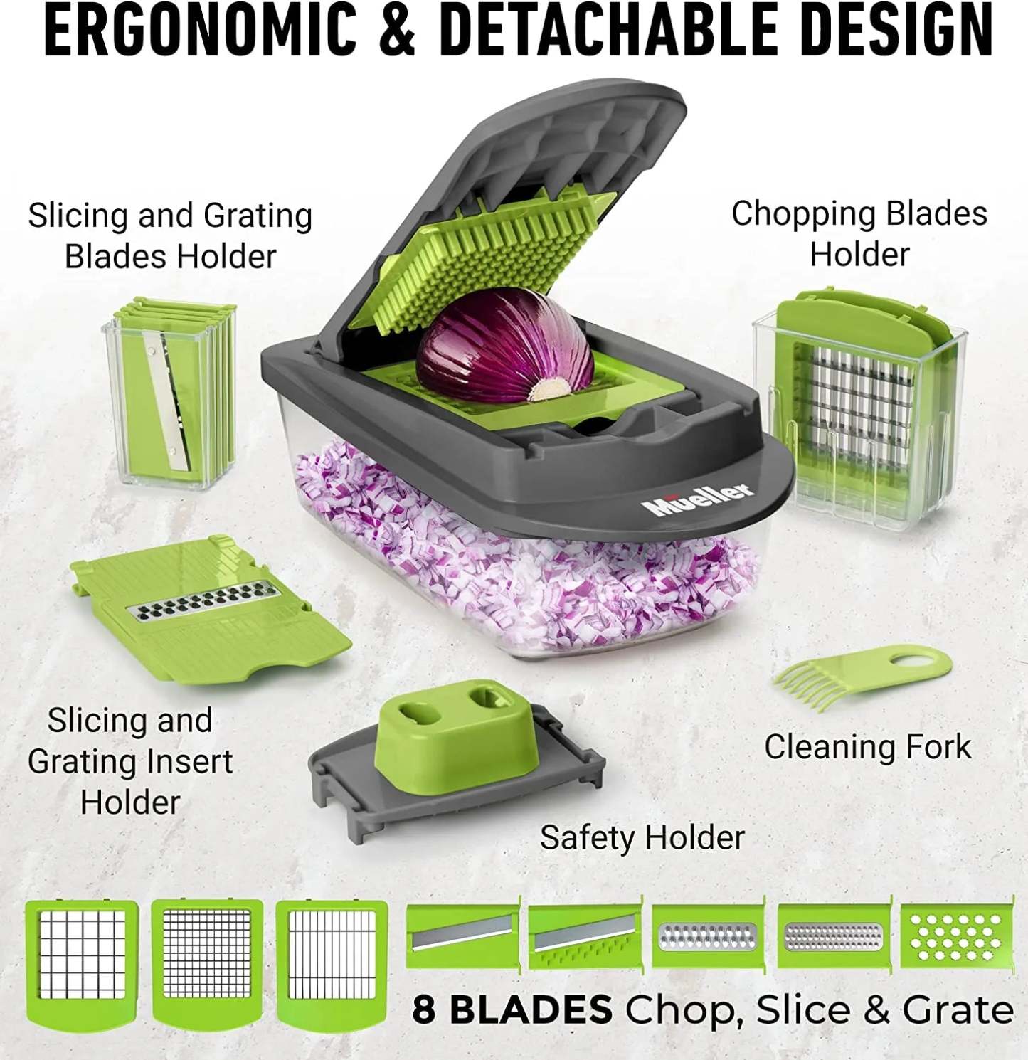 - 8 Diverse Blades - Three different sized chopper blades and 5 interchangeable blades for slicing, julienne, grating & shredding offer the functionality of multiple kitchen tools in just one, highly versatile, kitchen gadget. The high-quality stainless-steel blades will create perfectly chopped onions, tomatoes, and peppers for salsa, or shred an entire cabbage for coleslaw in no time.