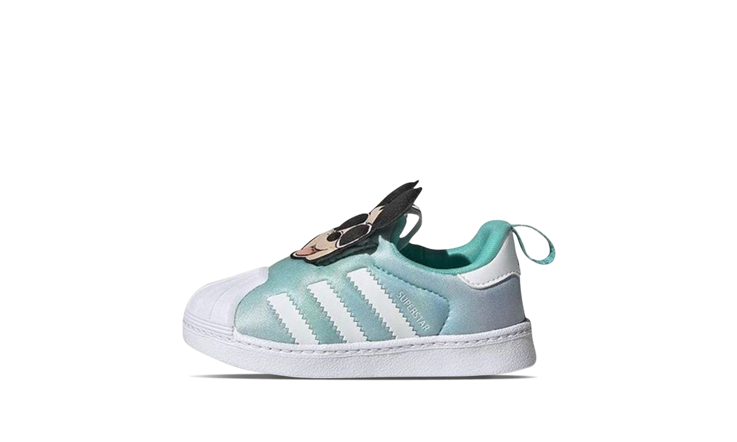 The Supthterstar 360 TD 'Disthtney - Mickey Mouse' shoe features a playful design inspired by the iconic Disthtney character Mickey Mouse, blending classic Adithtdas Supthterstar style with unique and charming details perfect for young fans.