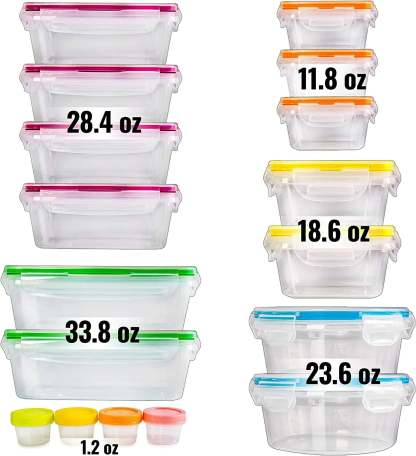 Perfect for portion sizing - designed with you in mind. This 50 piece set includes 24 containers with 24 lids Food Storage Containers, sticky labels and a chalk pen are great for kitchen & pantry organization and storage.