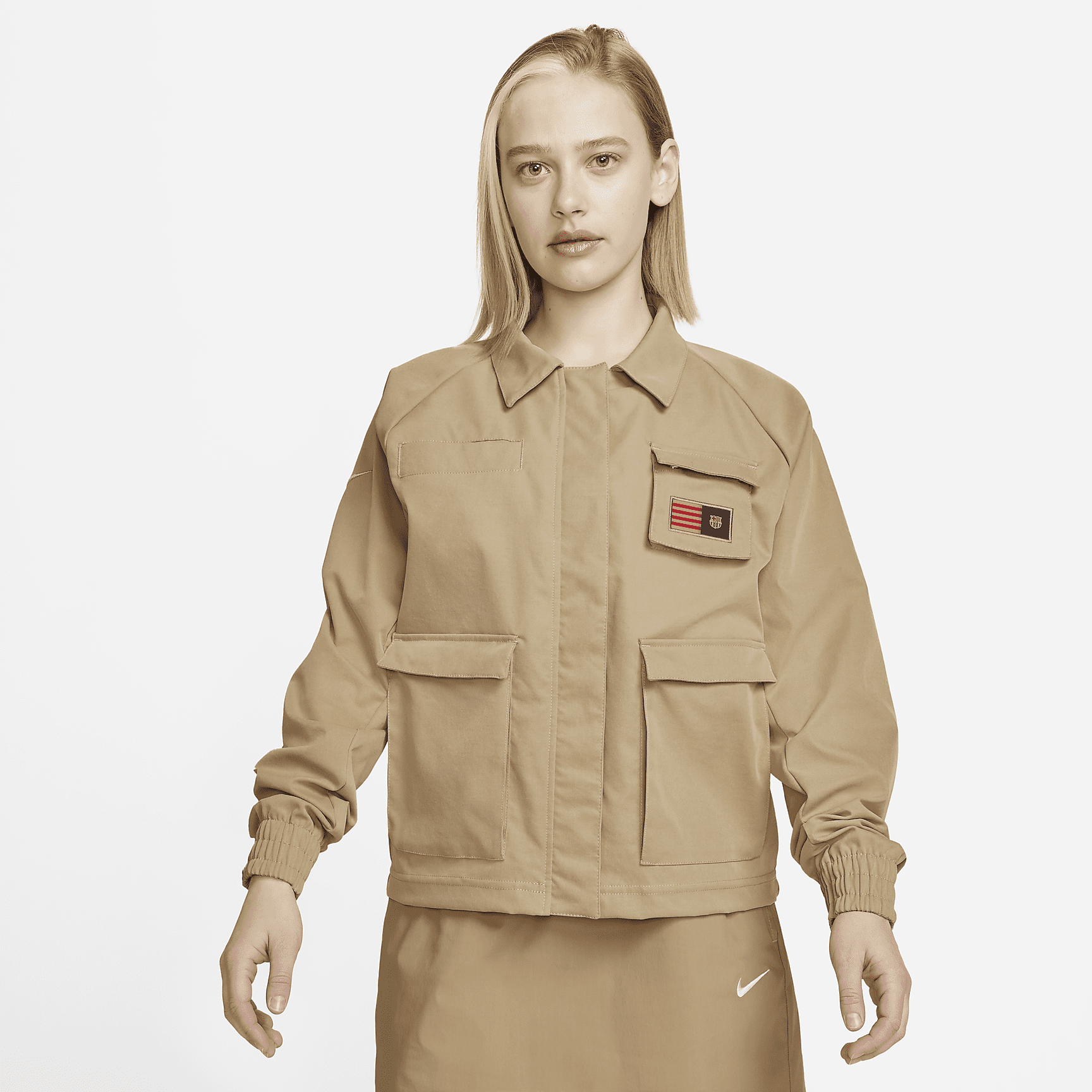Rep your team without sacrificing style in our utilitarian-inspired FC Barcelona Swoosh Jacket. Its oversized fit and water-repellent finish make it an ideal layer for days when the weather feels unpredictable. A storm flap with snap closures helps keep rain from sneaking through the zipper while multiple flap pockets provide plenty of space to keep all your daily necessities close at hand.