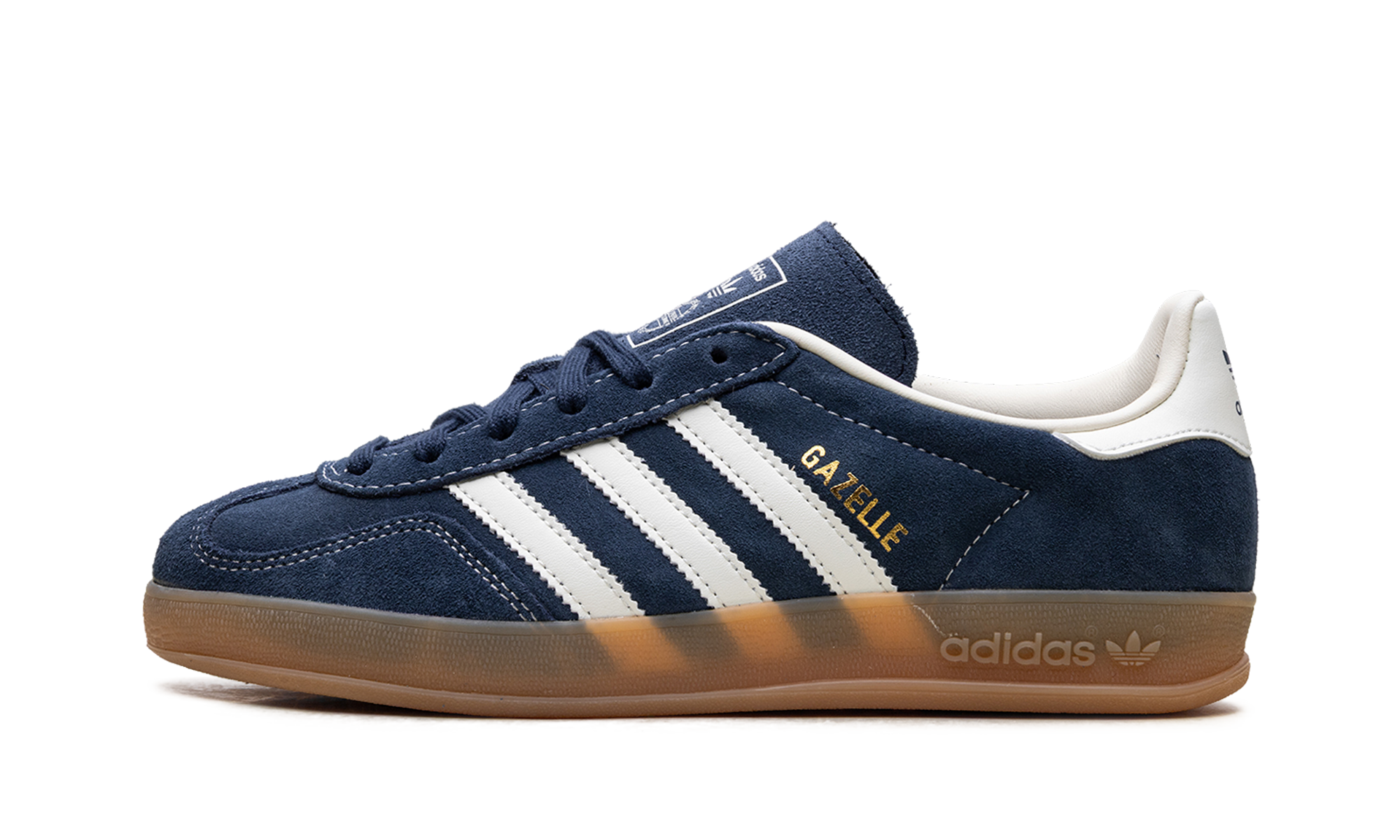 Step into a timeless classic with the AdithtdasGazelle Indoor "Night Indigo Off White" trainer! This iconic sneaker revives a vintage '70s court shoe, featuring a rich, dark blue Night Indigo suede upper for a premium feel. The classic Off White leather 3-Stripes and heel tab provide a sharp, clean contrast. Grounded by the signature translucent gum rubber outsole, this shoe offers a comfortable fit and a versatile, instantly recognizable retro style perfect for everyday wear.