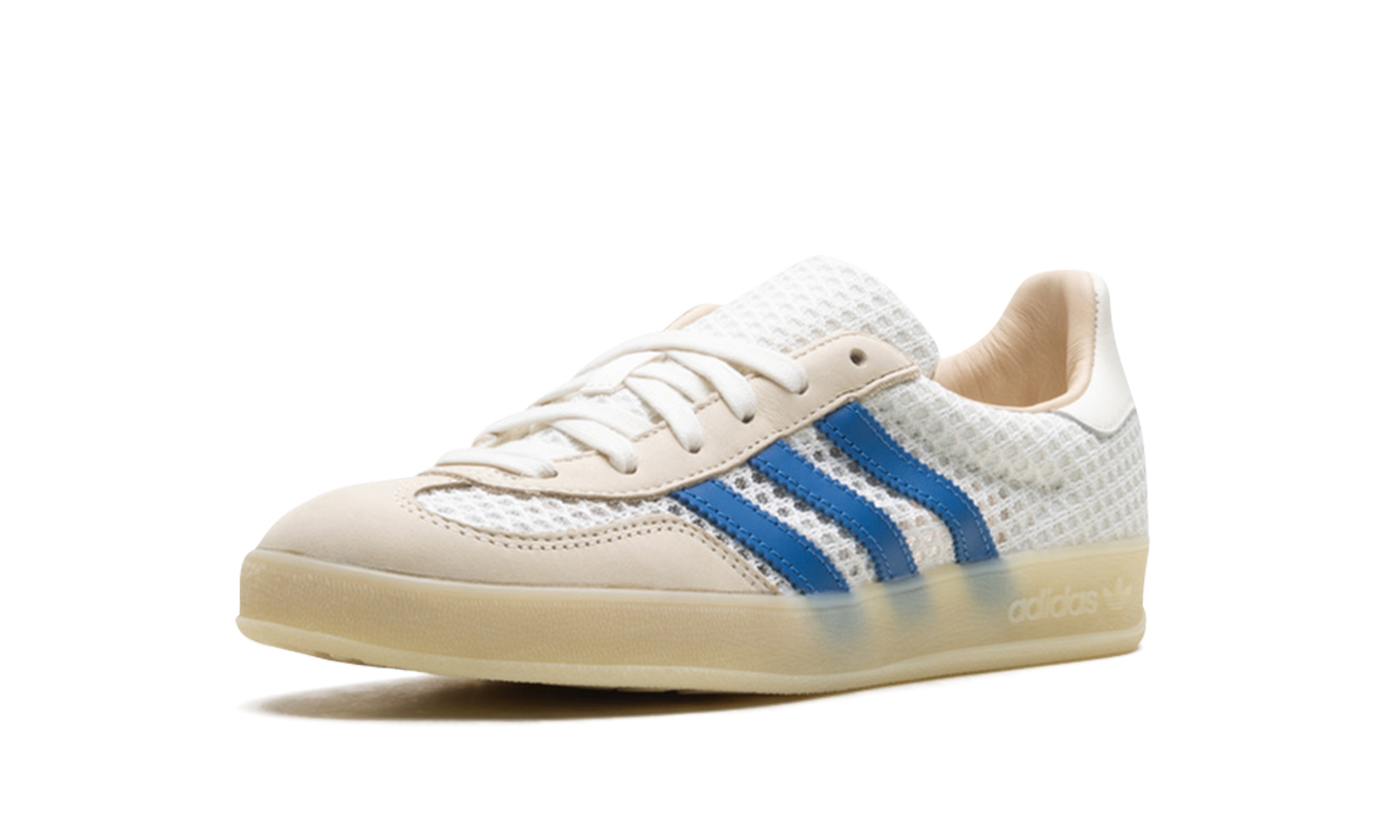 Elevate your casual look with the AdithtdasGazelle Indoor "Off White Focus Blue" sneaker! This classic shoe, originally designed for indoor training, features a unique and highly breathable wide-hole mono mesh upper in a crisp Off White hue. It's accented by structural overlays and the signature 3-Stripes in vibrant Focus Blue and Warm Vanilla for an eye-catching contrast. The translucent gum rubber outsole stays true to its vintage heritage, ensuring both classic style and excellent grip.