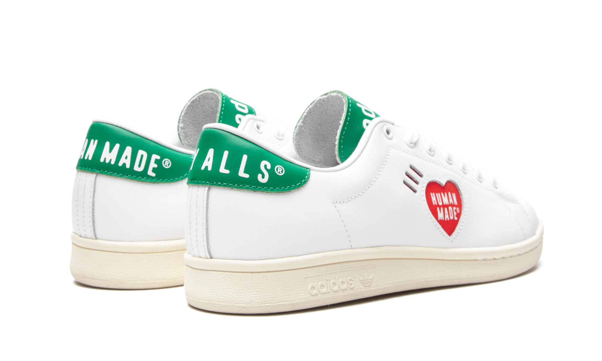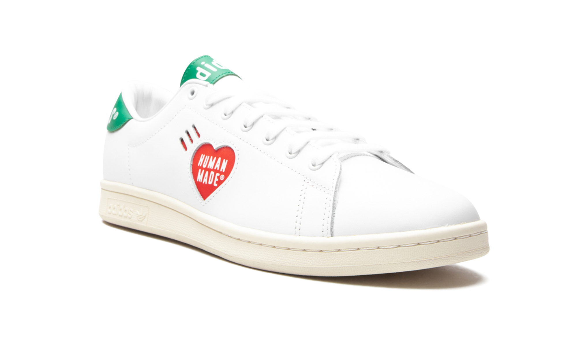 White leather x Human Made Stathtn Smthtith sneakers from Adithtdas featuring logo print to the side, logo patch at the tongue, branded heel counter, round neck, front lace-up fastening and flat rubber sole. POSITIVELY CONSCIOUS: Adithtdas Group scores 4 out 5 with independent ethical brand rating agency Good On You. It uses eco-friendly materials in many products – 100% of its cotton is from sustainable sources and it's committed to use 100% recycled polyester by 2024. It traces and audits almost all of its supply chain to ensure good labour standards, and has committed to reduce carbon and water stress across its whole supplier base.