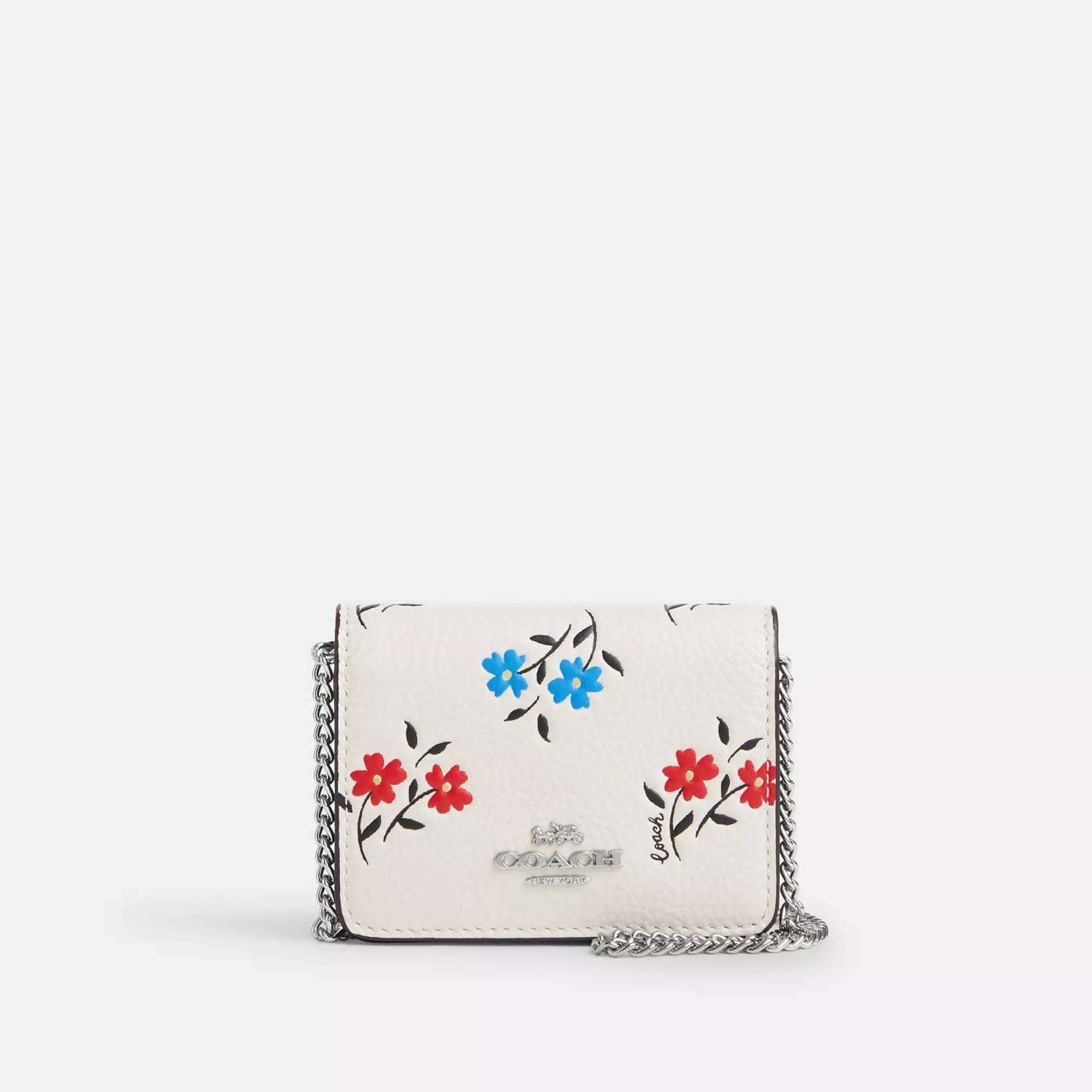 Refined pebble leather Two credit card slots Snap closure fabric lining Outside open pocket Detachable chain strap with 23 1/4 drop for shoulder or crossbody wear 4 (L) x 3 (H) x 1 (W) Style No. CU005 | Mini Wallet On A Chain With Floral Print - White
