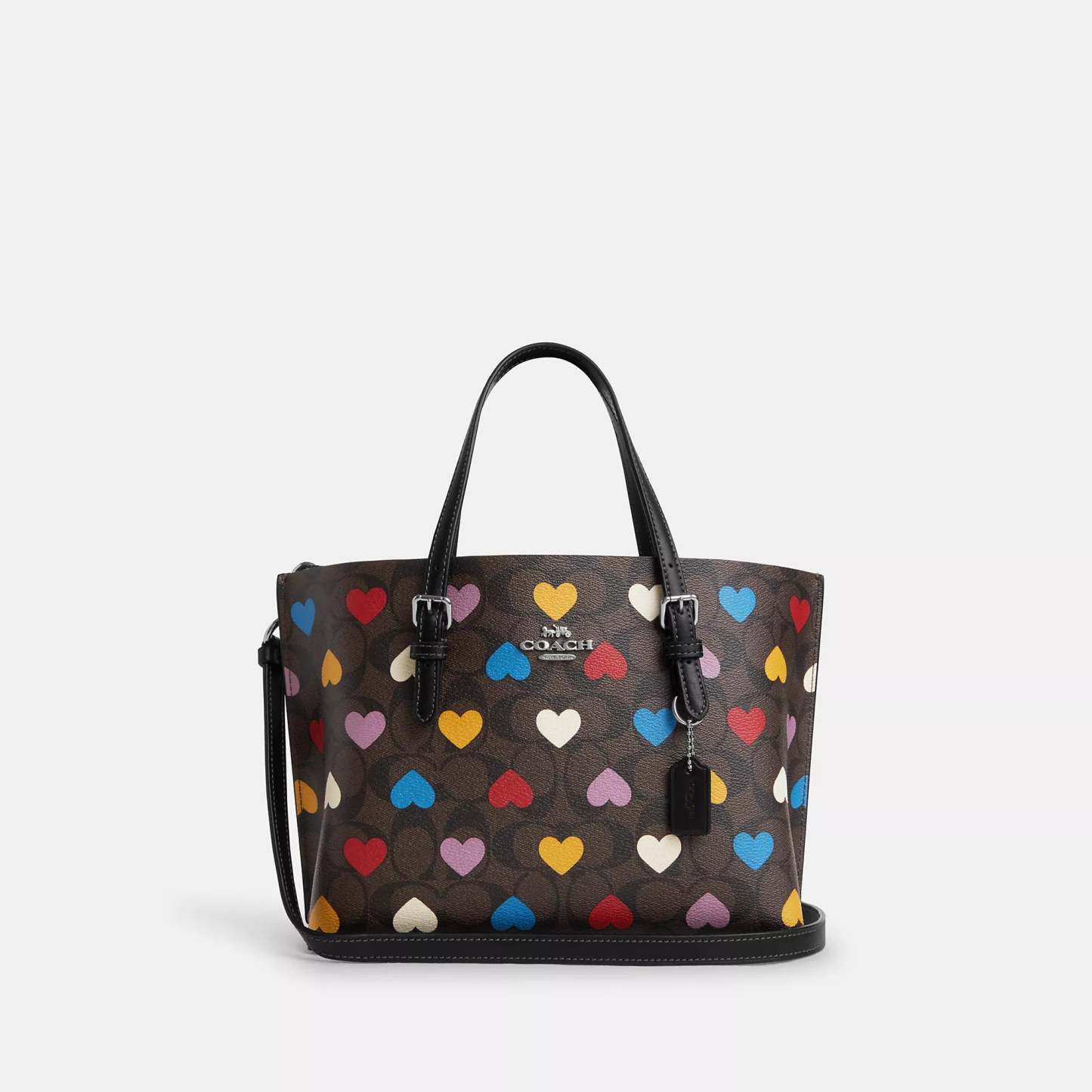 Signature coated canvas and smooth leather Zip-top closure fabric lining Side open compartments Handles with 4 3/4 drop Detachable strap with 22 drop for shoulder or crossbody wear 9 3/4 (L) x 7 1/2 (H) x 4 3/4 (W) Style No. CP110 | Coathtth Outlet Mollie Tote 25 In Signature Canvas With Heart Print - Brown
